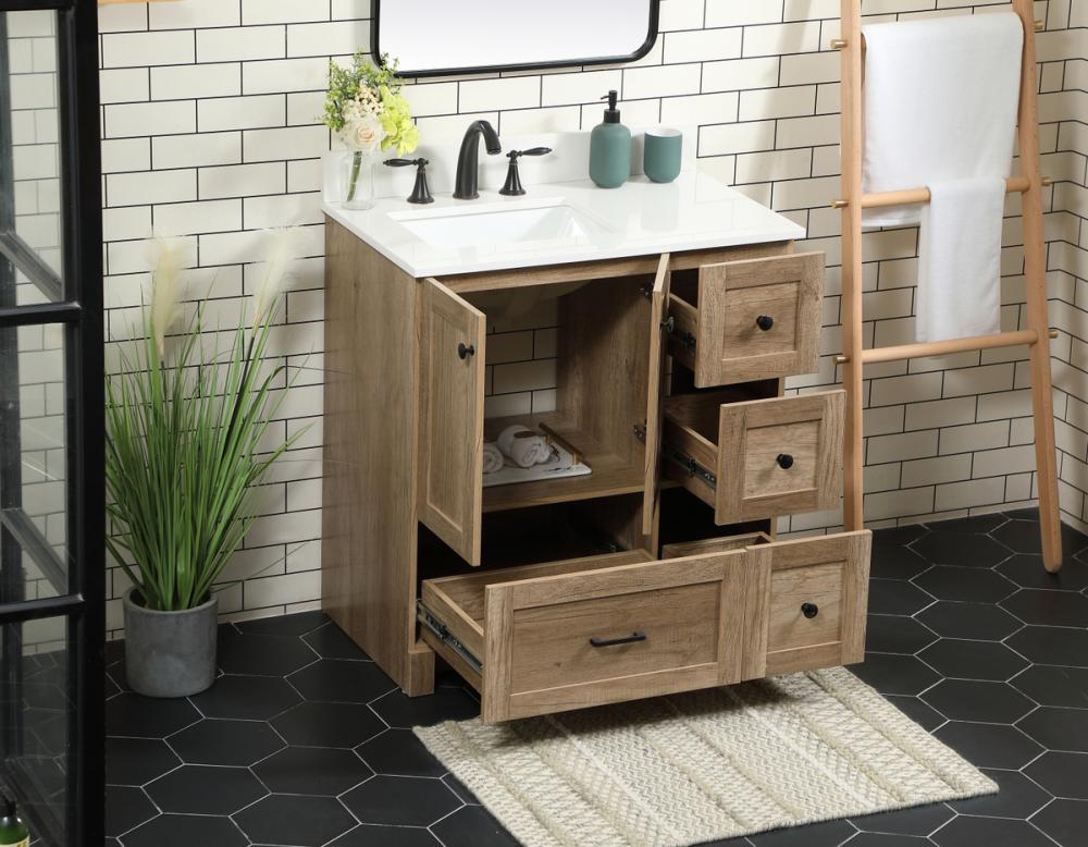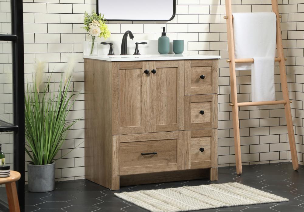 Delve into a world of minimalistic fashion and contemporary styling with this farmhouse 32" vanity. The clean faux lines anchors the weathered design. Black handle adorns the two doors hiding the base of the integrated porcelain sink while the bottom drawer and side drawers allow you to store your bathroom necessities and toiletries. The compact size makes it the perfect vanity for any bathroom or powder room, regardless of size. Comes with a matching backsplash to complete the look and protects your wall.