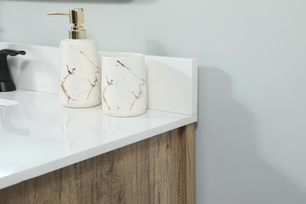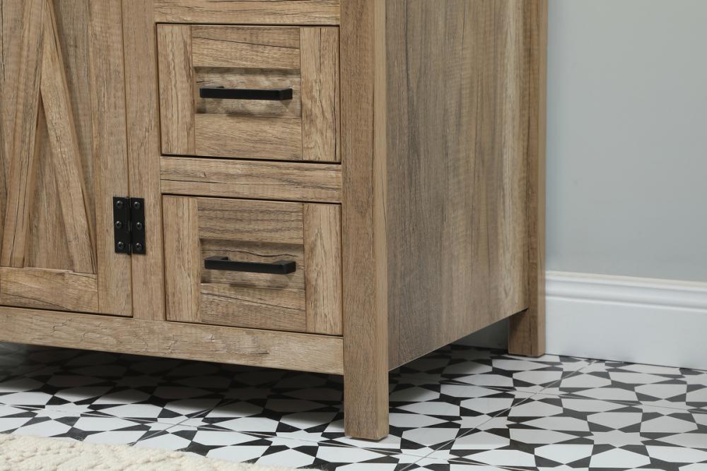 Reminiscent of barn doors, the two door cabinet and four drawers adds both stylistic charm and function with its plethora of storage options for all your bathroom essentials. Whether for your bathroom or the guests', everyone will marvel at its classic look for traditional and farmhouse aesthetics. A slab of engineered marble rounds out the piece up top, as well as the porcelain under mount sink and predrilled faucet holes. This vanity arrives fully assembled. Comes with a matching backsplash to complete the look and protects your wall.