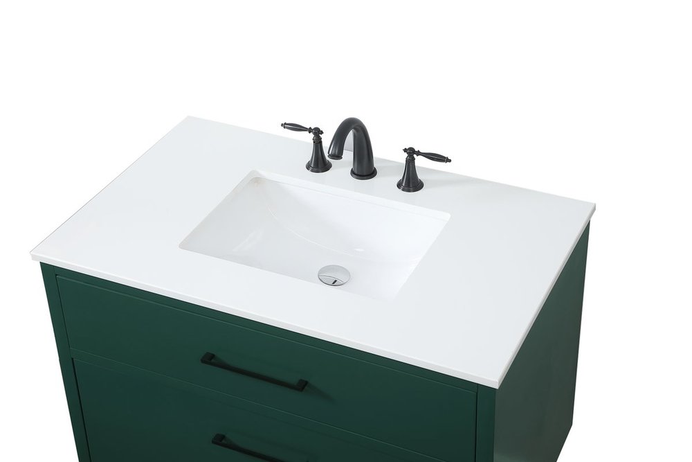 Delve into a world of minimalistic fashion and contemporary styling with this midcentury modern 36" vanity. The clean lines anchors the design, while the oblique tapered cylinder legs add subtle interest. However, the artful juxtaposition between the green and white top creates a blend of bright modernity and classical traditions. A black handle adorns the top fake drawer hiding the base of the integrated porcelain sink while another one allows you to pull the bottom drawer out, letting you store your bathroom necessities and toiletries. The compact size makes it the perfect vanity for any bathroom or powder room, regardless of size.
