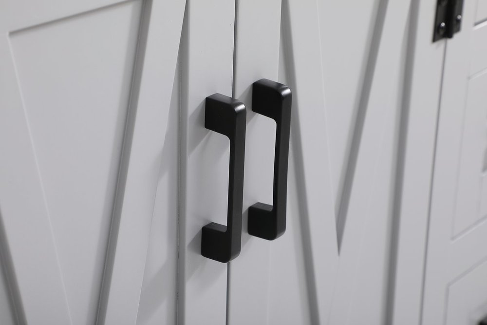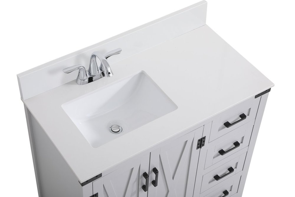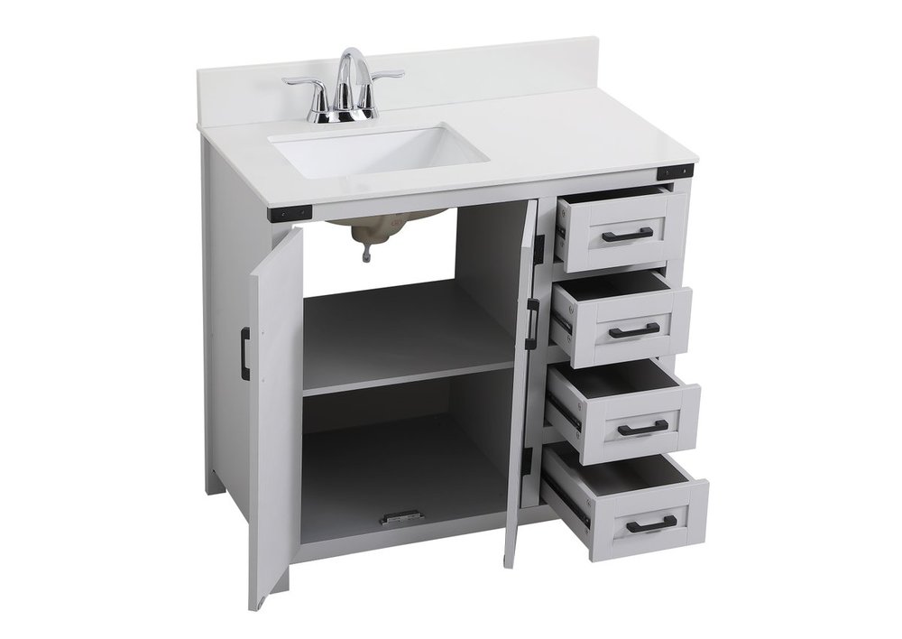 The Grant Collection 36 in. vanity is a practical and stylish upgrade for your bathroom. Its grey finish is highlighted by the engineered white stone top featuring an under-counter rectangular sink. The cross patterned cabinet doors are decorated with bold black hinges and bar pulls. The cabinet has four pullout drawers, ideal for towels, washcloths and bath accessories Comes with a matching backsplash to complete the look and protects your wall.