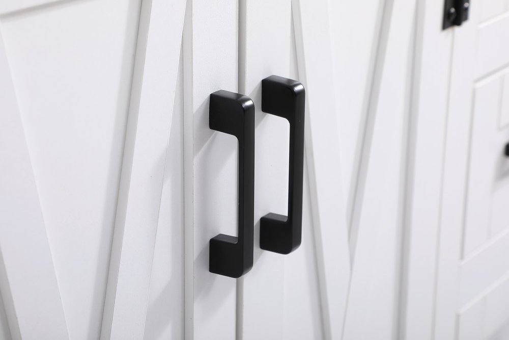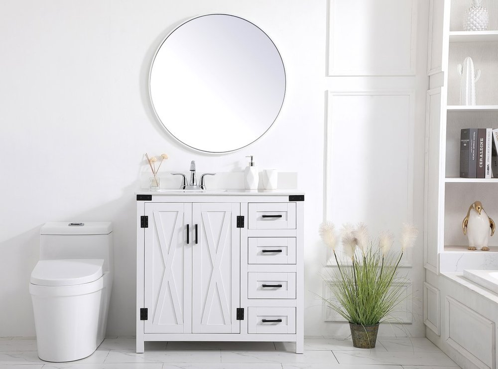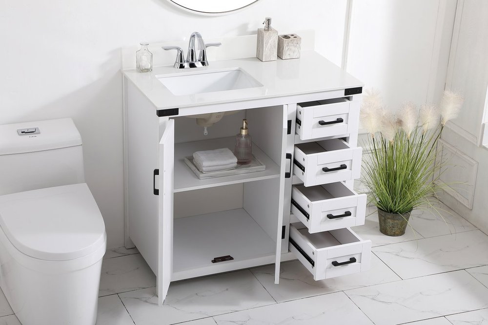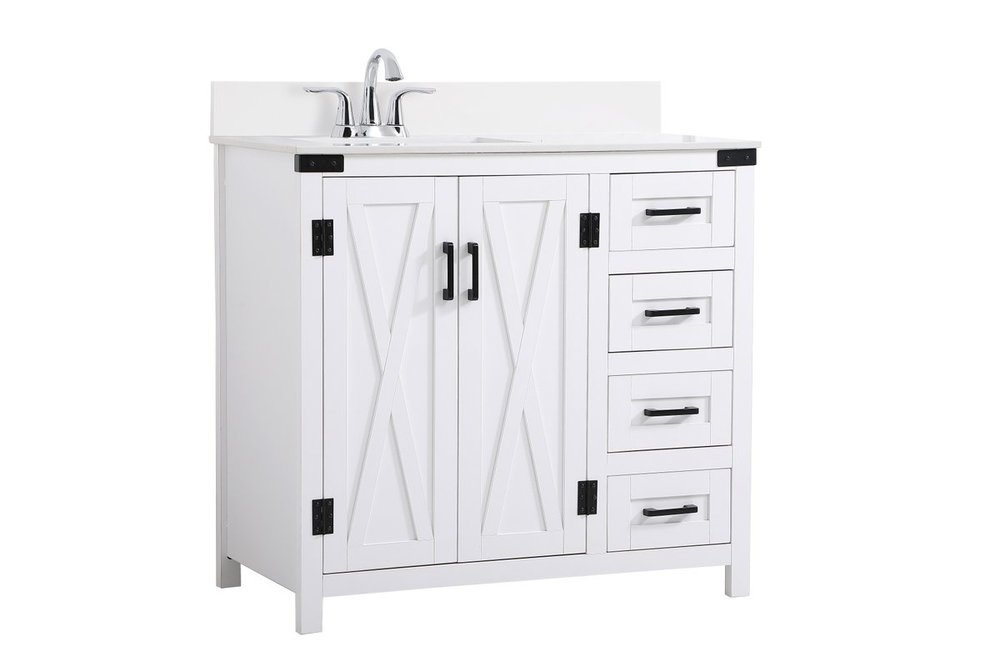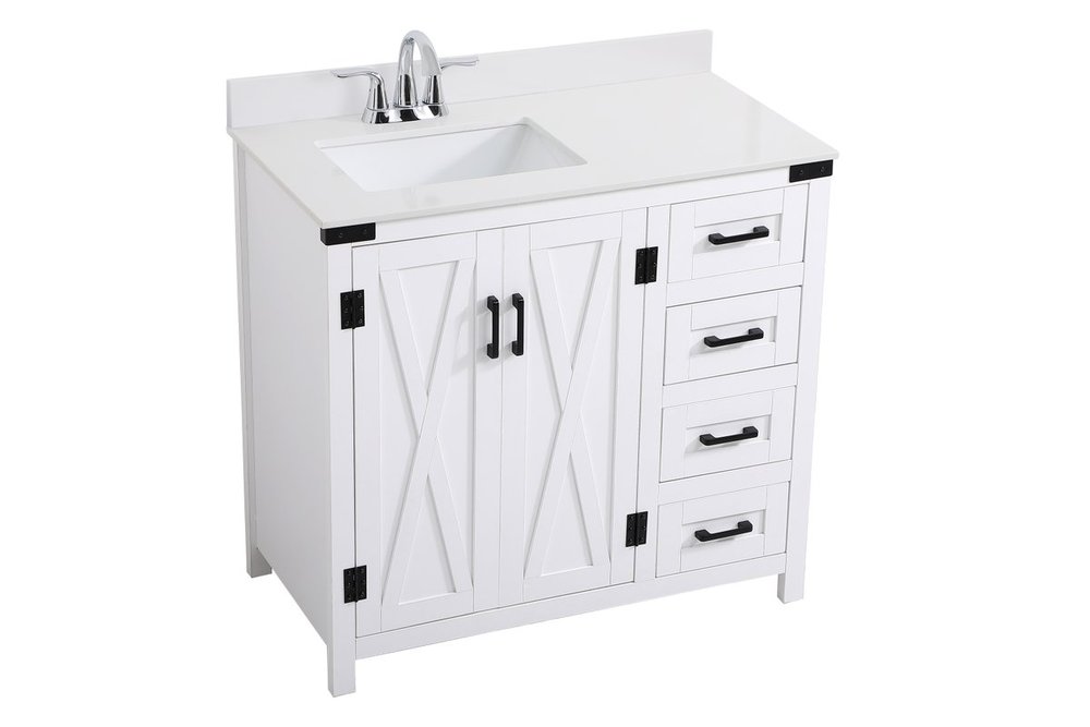 The Grant Collection 36 in. vanity is a practical and stylish upgrade for your bathroom. Its white finish is highlighted by the engineered white stone top featuring an under-counter rectangular sink. The cross patterned cabinet doors are decorated with bold black hinges and bar pulls. The cabinet has four pullout drawers, ideal for towels, washcloths and bath accessories Comes with a matching backsplash to complete the look and protects your wall.