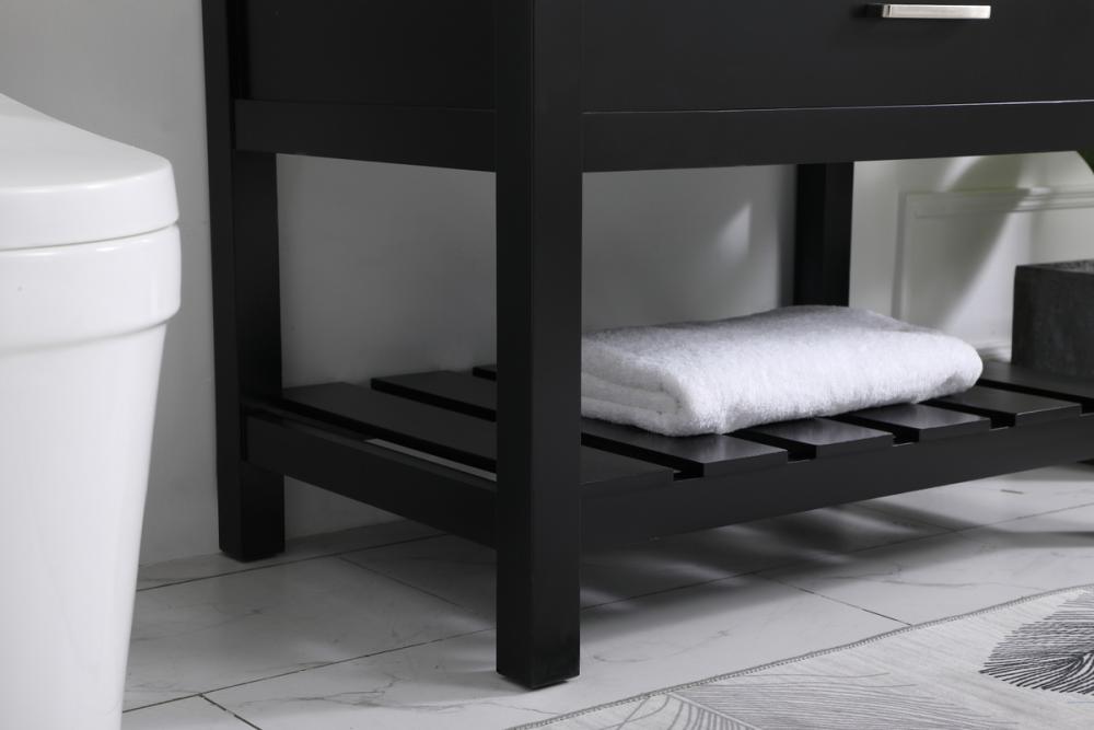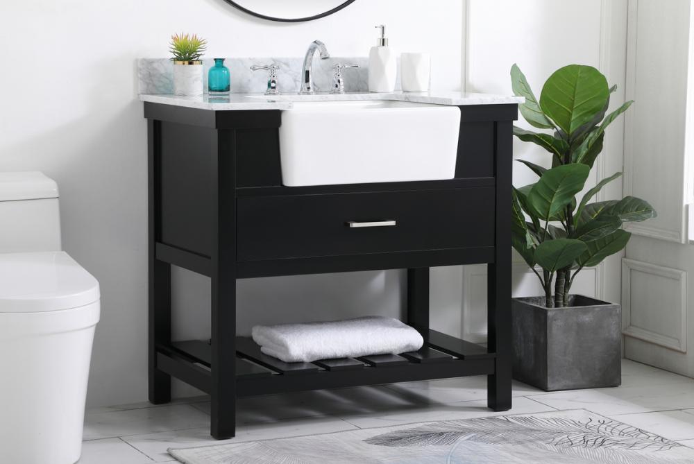 Make the most of your space with this farmhouse style bathroom vanity. Complements well with its beautiful finish, carrara white marble countertop, and the contemporary slender handle bar that sits on the functional drawers with soft closing mechanism, allowing you to store an assortment of bathroom essentials. The lower shelf makes it the perfect space to hold new towels for your guests. This stylish vanity ensures both form and function in your bathroom for you and your guests.