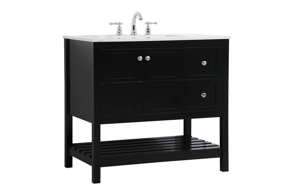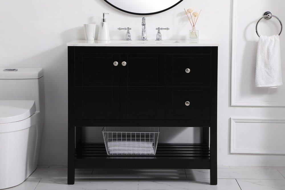 The subtle beauty of the Theo collection 36" vanity in a black finish exudes comfortable luxury. Its modern, yet traditional beauty will surely dress up your bathroom or powder room without any fuss. The white stone countertop and porcelain undermount sink shows quiet opulence, and the legs support upright without fail. Brushed Nickel hardware complements the trendy black finish, with pulls adorning the two cabinet doors and two drawers, showcasing ample storage space within. Slated shelf allows for additional space to organize your towels. Whether this vanity is in your bathroom or for guests, its presence will surely elevate the aesthetics of your room.