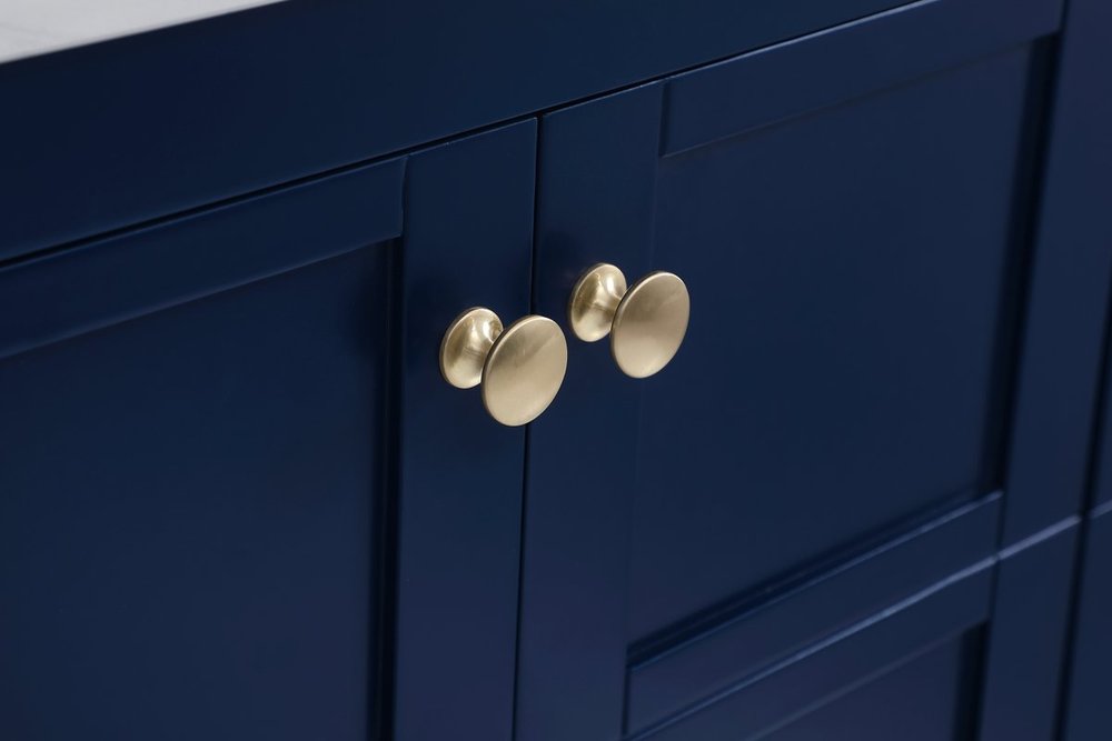 The subtle beauty of the Theo collection 36" vanity in a blue finish exudes comfortable luxury. Its modern, yet traditional beauty will surely dress up your bathroom or powder room without any fuss. The white stone countertop and porcelain undermount sink shows quiet opulence, and the legs support upright without fail. Gold hardware complements the trendy blue finish, with pulls adorning the two cabinet doors and two drawers, showcasing ample storage space within. Slated shelf allows for additional space to organize your towels. Whether this vanity is in your bathroom or for guests, its presence will surely elevate the aesthetics of your room. Comes with a matching backsplash to complete the look and protects your wall.