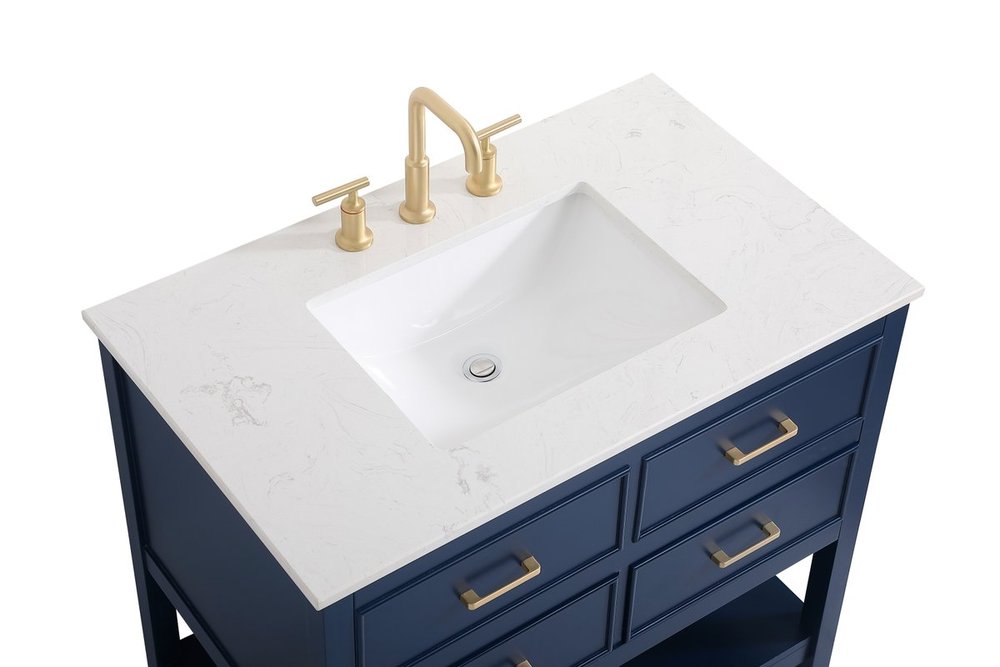 Make the most of your space with this traditional style bathroom vanity. Complements well with many aesthetics with its beautiful finish, calacatta engineered marble countertop, and the contemporary slender handle bar that sits on two upper false drawer and two lower u-shaped drawer, allowing you to store an assortment of bathroom essentials. The lower shelf makes it the perfect space to hold new towels for your guests. This compact vanity ensures both form and function in your bathroom or powder room for you and your guests.