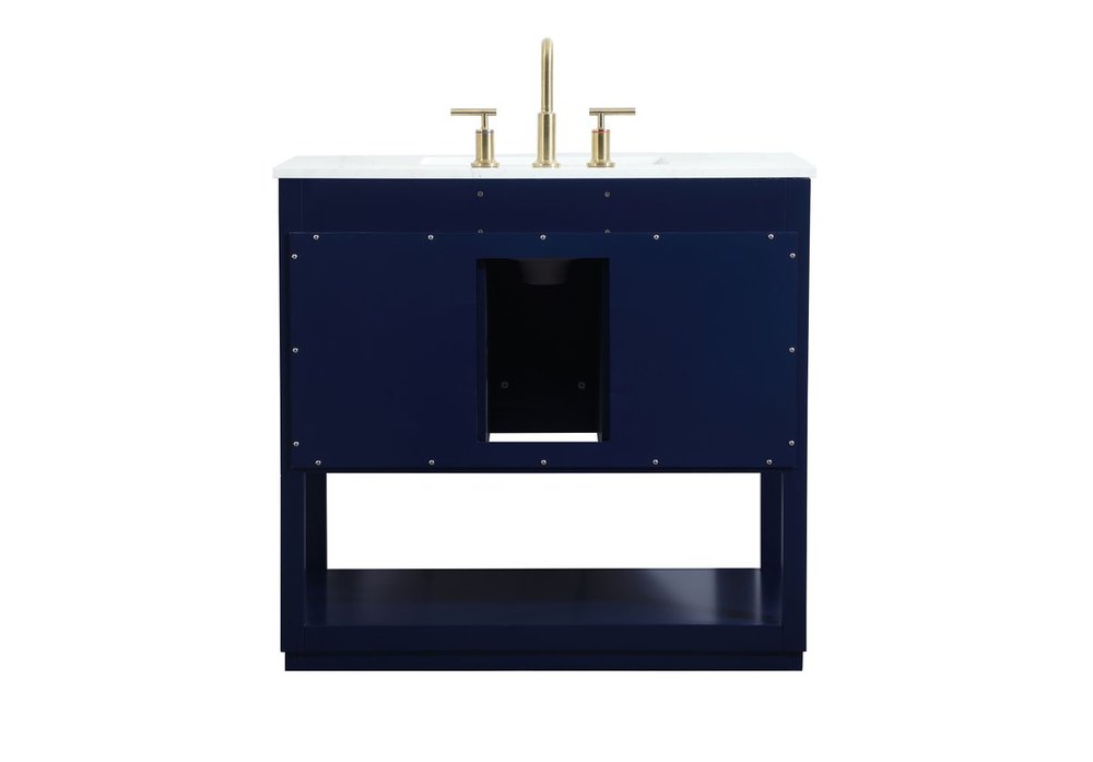 Live in modern comfort with this 36" blue finish vanity. Dressed in a blue and sleek gold metal hardware, its contemporary style will have your bathroom or powder room elevated in modern sophistication. The open shelf at the base and four drawers reveal ample storage space for your bathroom essentials and miscellany. Clean lines create its own visual interest, adding trendy looks to your already chic room.