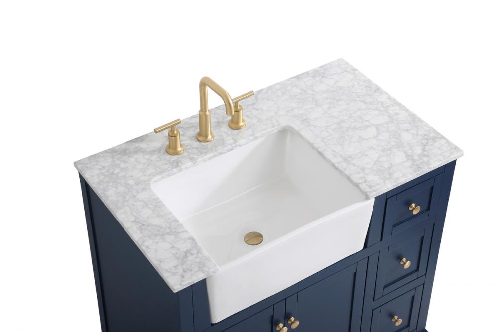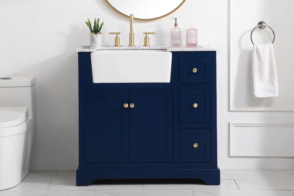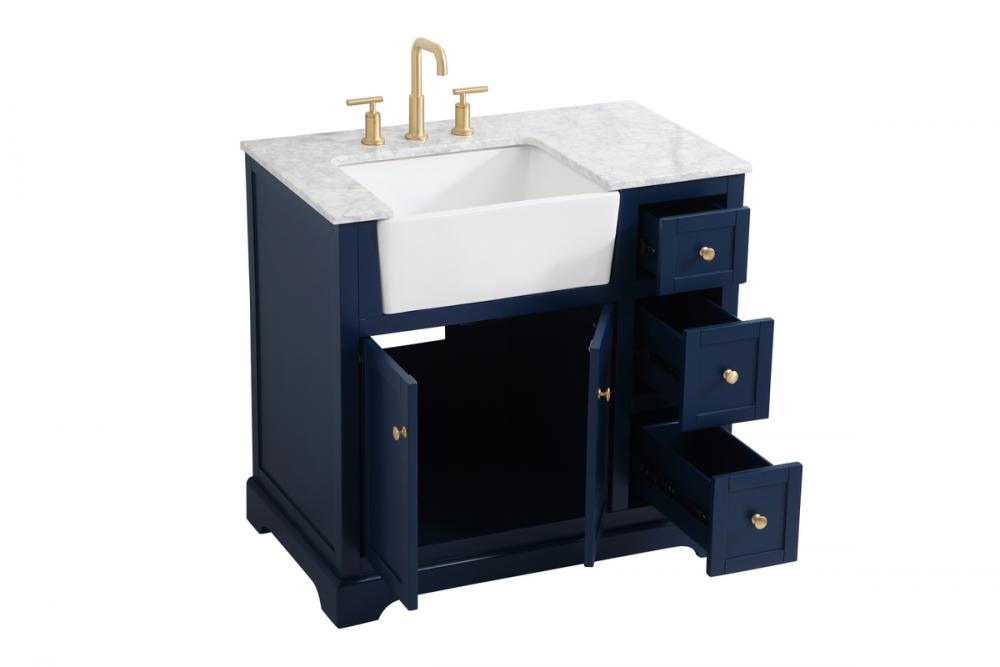 Make the most of your space with this farmhouse style bathroom vanity. Complements well with its beautiful finish, carrara white marble countertop, and the contemporary slender handle bar that sits on the functional drawers with soft closing mechanism, allowing you to store an assortment of bathroom essentials. The lower shelf makes it the perfect space to hold new towels for your guests. This stylish vanity ensures both form and function in your bathroom for you and your guests.