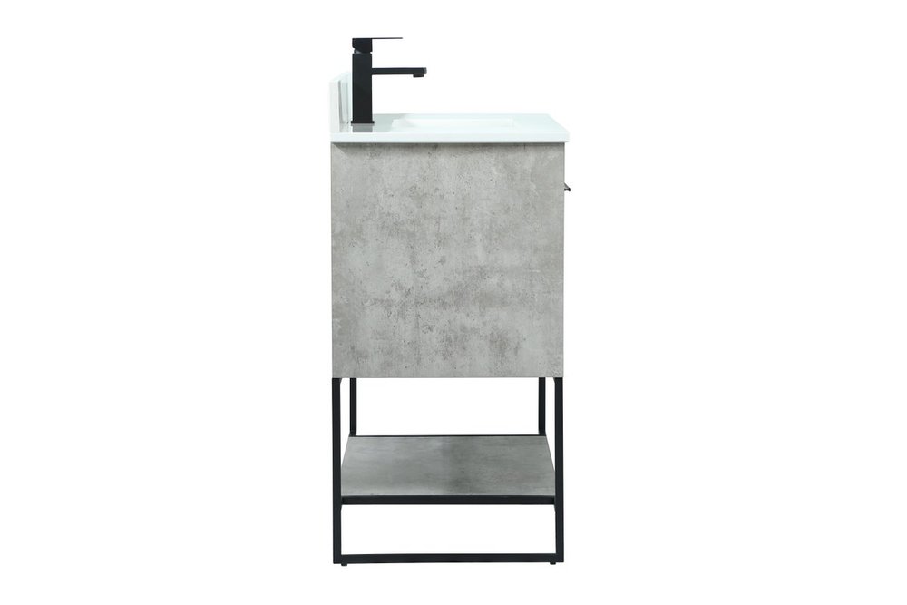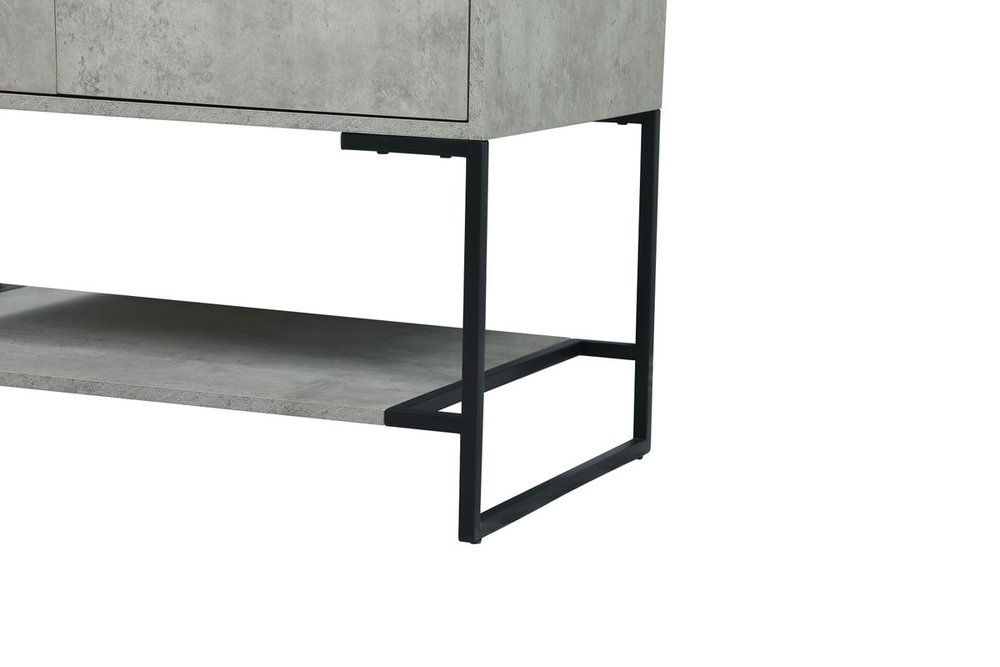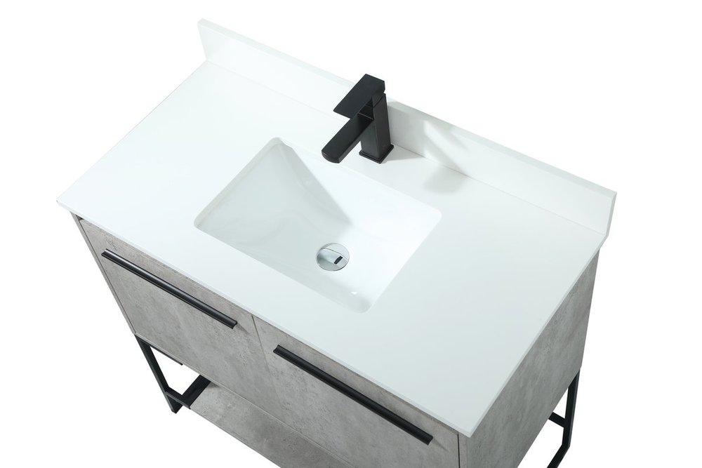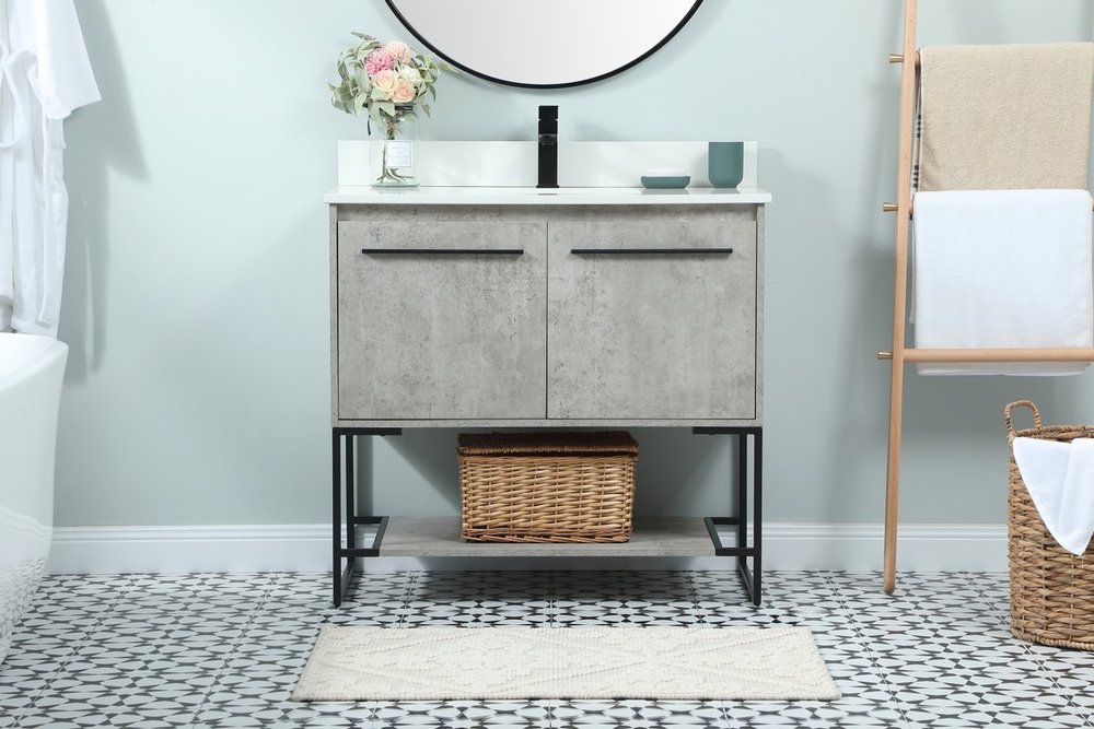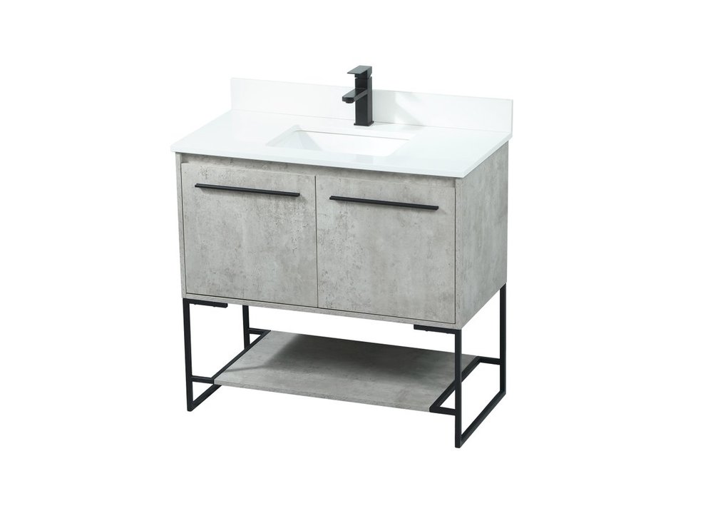 Live in modern comfort with this 36" concrete grey finish vanity. Dressed in a concrete grey and sleek black metal hardware, its contemporary style will have your bathroom or powder room elevated in industrial sophistication. The open shelf at the base and two doors reveal ample storage space for your bathroom essentials and miscellany. Clean lines create its own visual interest, adding trendy looks to your already chic room. Comes with a matching backsplash to complete the look and protects your wall.