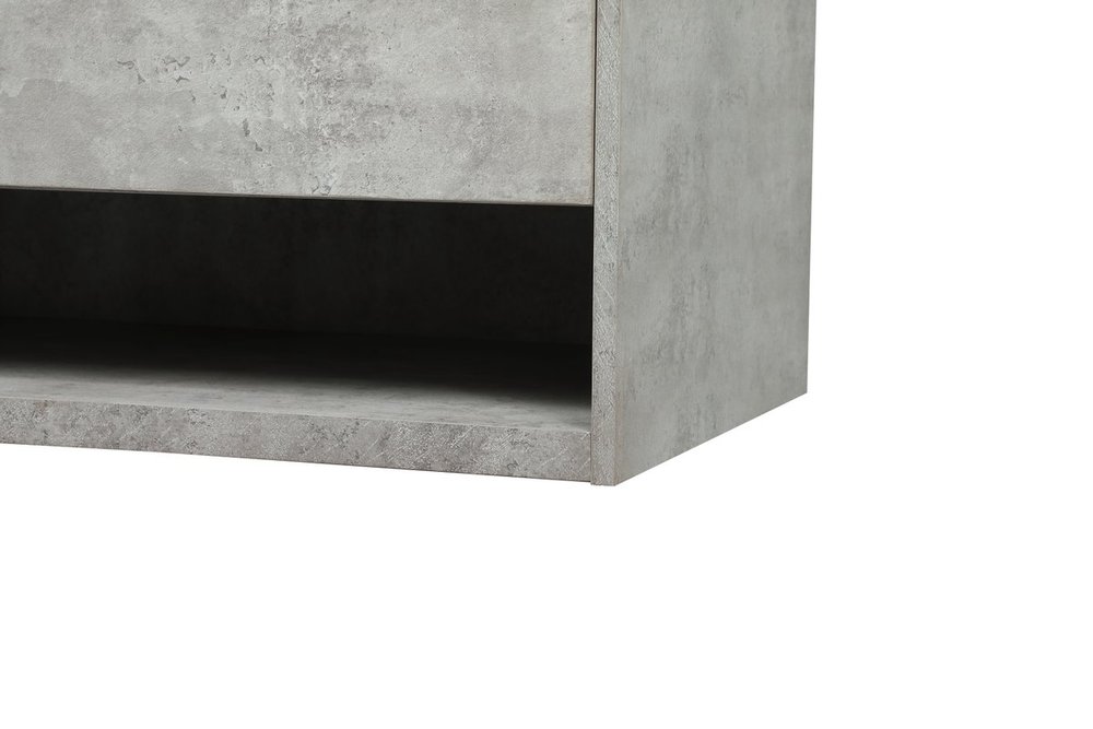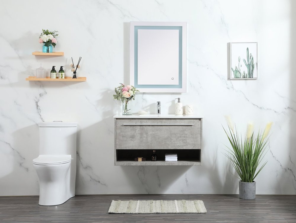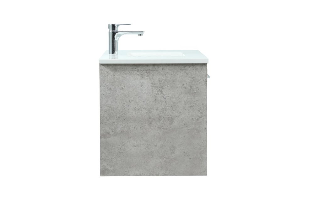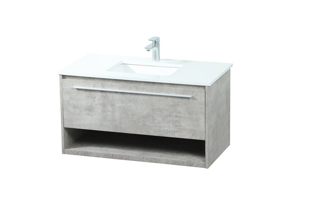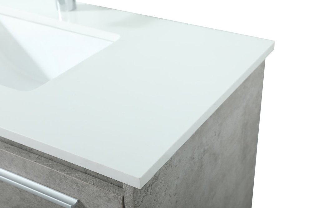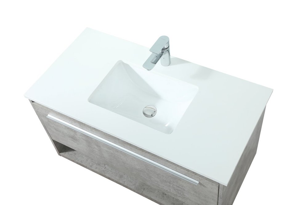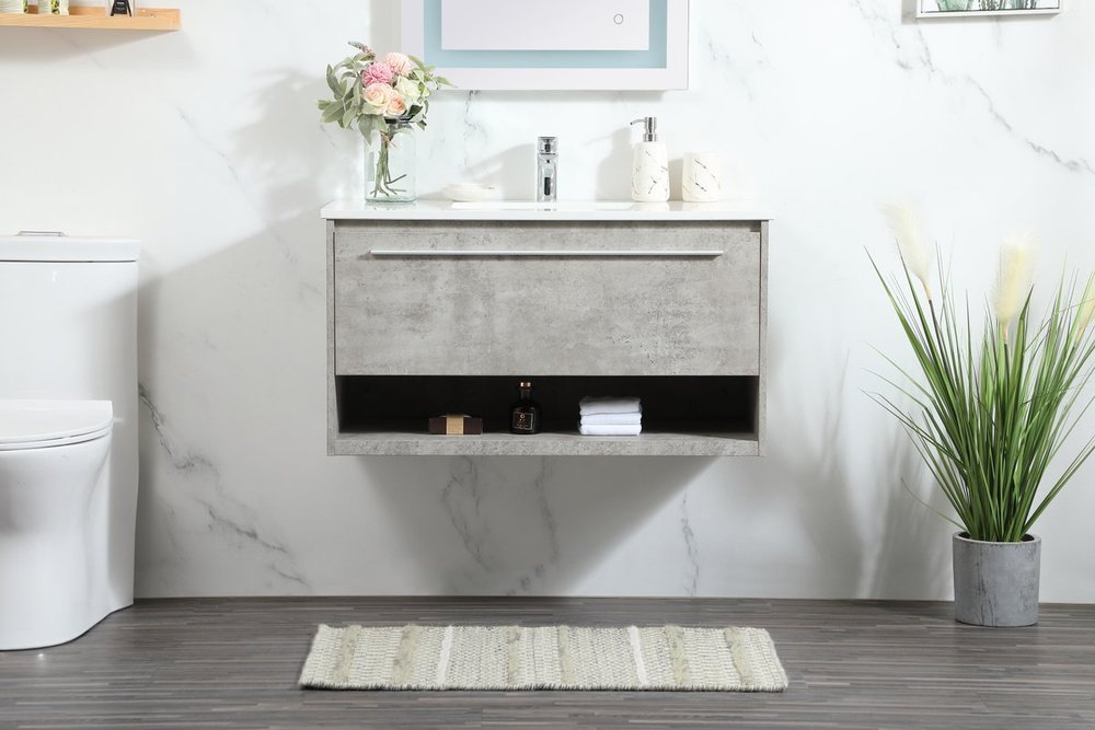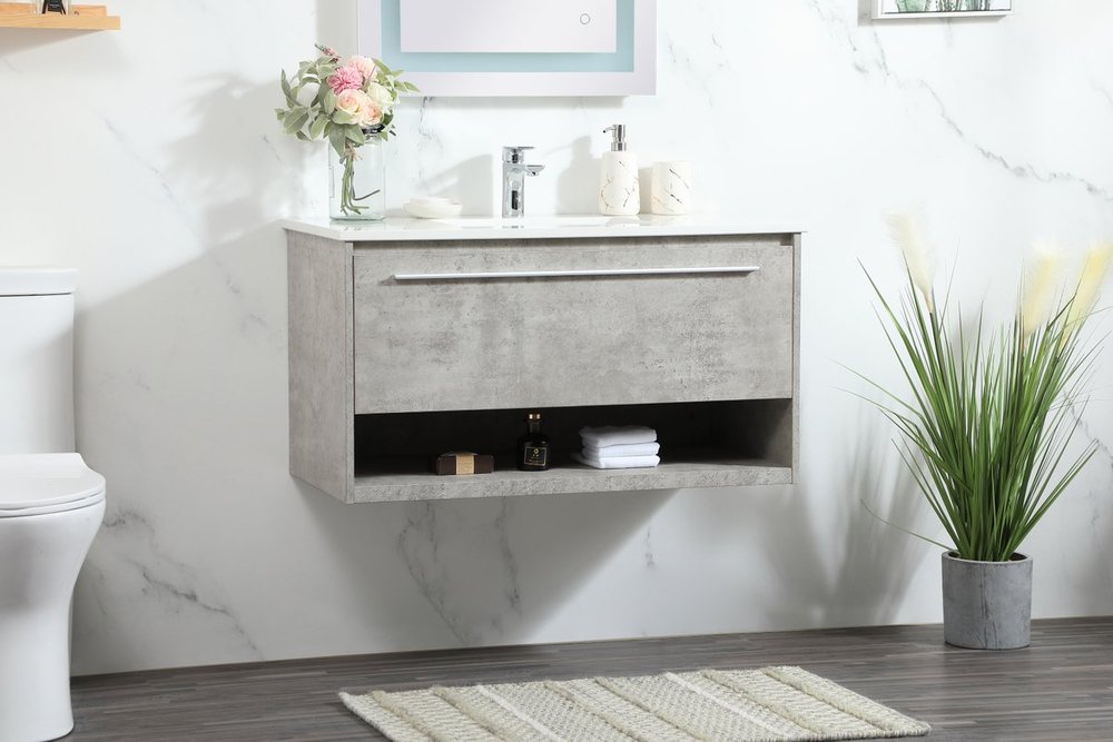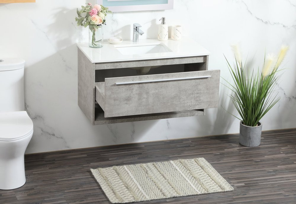 Save space and make your bathroom appear bigger with this floating vanity. Its minimal design will have you in awe, while its clean lines will leave your room feeling fresh and uncluttered. The Single u-drawer pulls out for storage while the open space below allows you to place extra towels or various other essentials. The ivory white engineered marble counter top with porcelain sink adds refined luxe while the aluminum barpull style handle adorn the vanity face.
