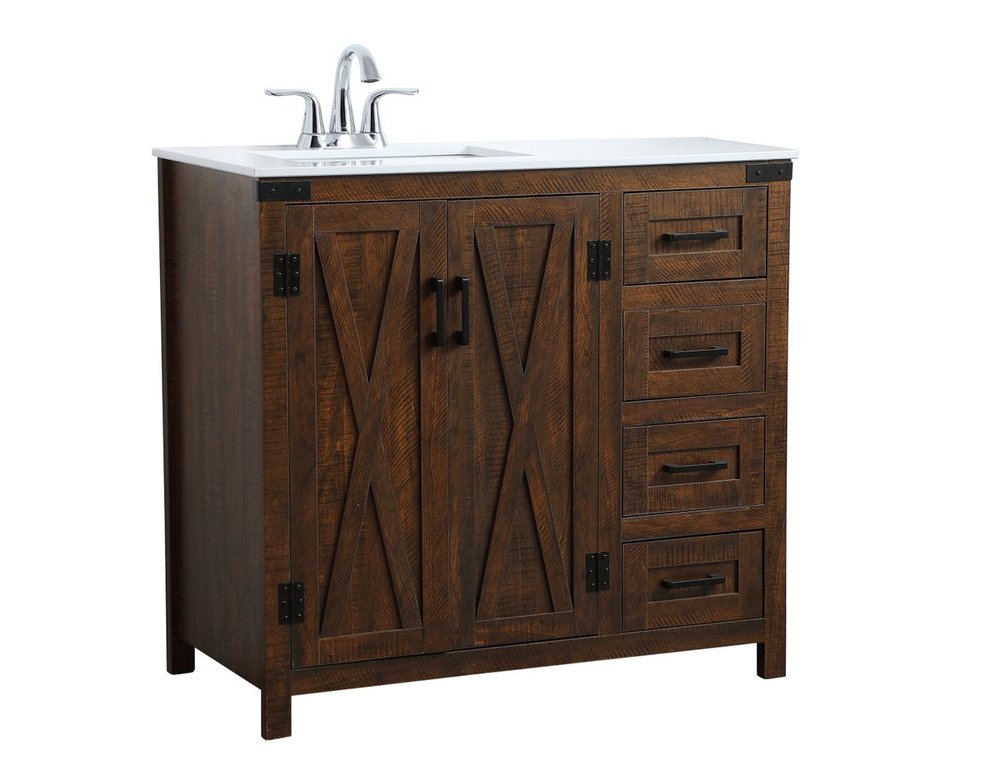 The 36" espresso finish vanity recalls a time of rustic nature. Reminiscent of barn doors, the 2 door cabinet and 4 drawers add both stylistic charm and function with its plethora of storage options for all your bathroom miscellany. Whether for your bathroom or the guests', everyone will marvel at its lively personality.
