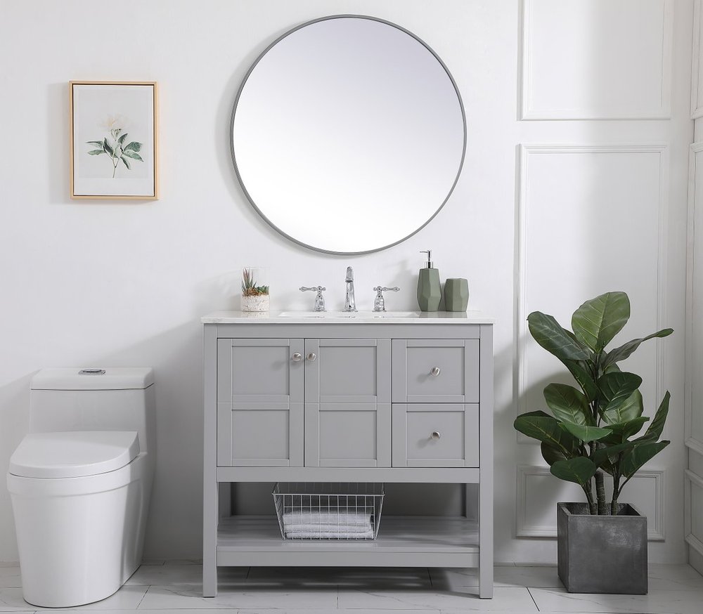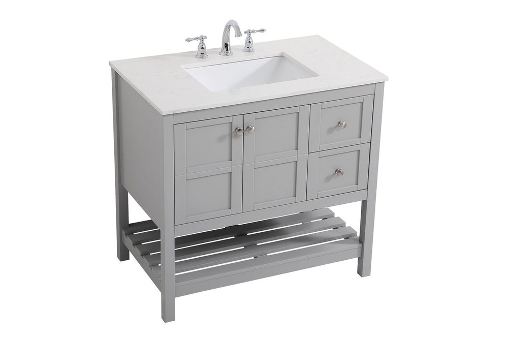 The subtle beauty of the Theo collection 36" vanity in a gray finish exudes comfortable luxury. Its modern, yet traditional beauty will surely dress up your bathroom or powder room without any fuss. The white stone countertop and porcelain undermount sink shows quiet opulence, and the legs support upright without fail. Brushed Nickel hardware complements the trendy gray finish, with pulls adorning the two cabinet doors and two drawers, showcasing ample storage space within. Slated shelf allows for additional space to organize your towels. Whether this vanity is in your bathroom or for guests, its presence will surely elevate the aesthetics of your room.