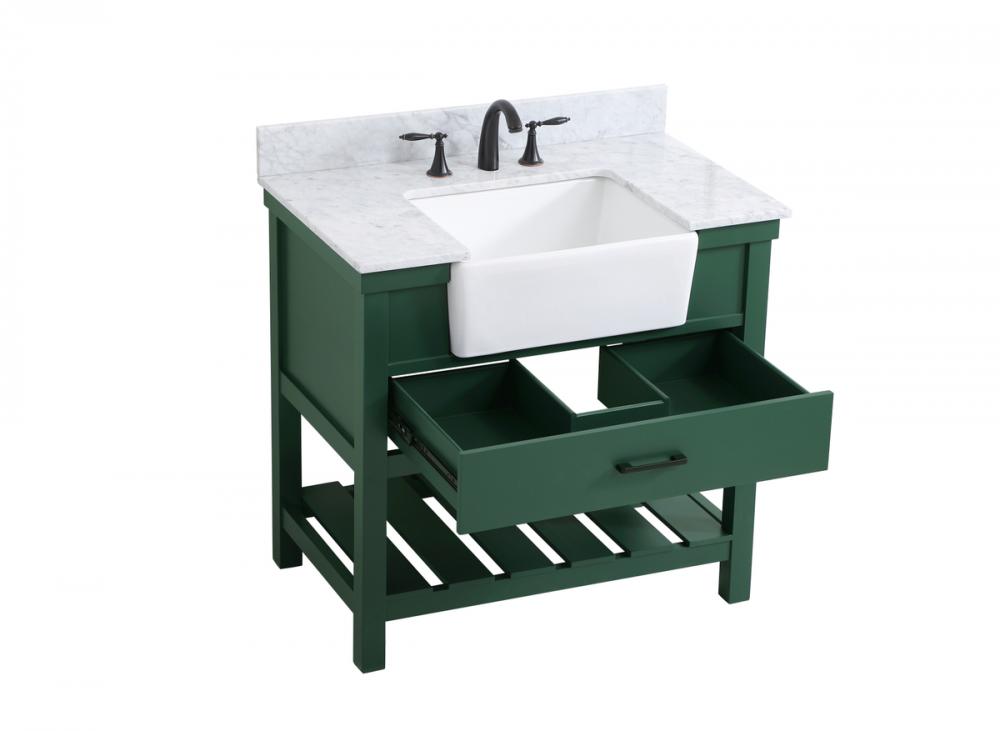 Make the most of your space with this farmhouse style bathroom vanity. Complements well with its beautiful finish, carrara white marble countertop, and the contemporary slender handle bar that sits on the functional drawers with soft closing mechanism, allowing you to store an assortment of bathroom essentials. The lower shelf makes it the perfect space to hold new towels for your guests. This stylish vanity ensures both form and function in your bathroom for you and your guests.