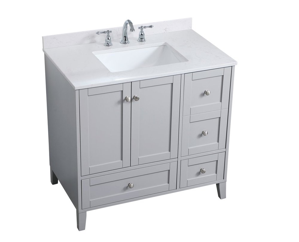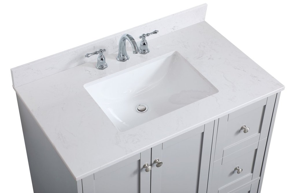 While unassuming, this 36" vanity in a grey finish sure knows how to redefine luxury. The sleek brushed nickel knobs adorn the double cabinet doors and 3 drawers which allow you to store your bathroom toiletries and necessities. Standing strong on oblique legs and dressed with a Calacatta engineered marble countertop, this vanity will surely create beauty and casual elegance in your bathroom or powder room. Comes with a matching backsplash to complete the look and protects your wall.