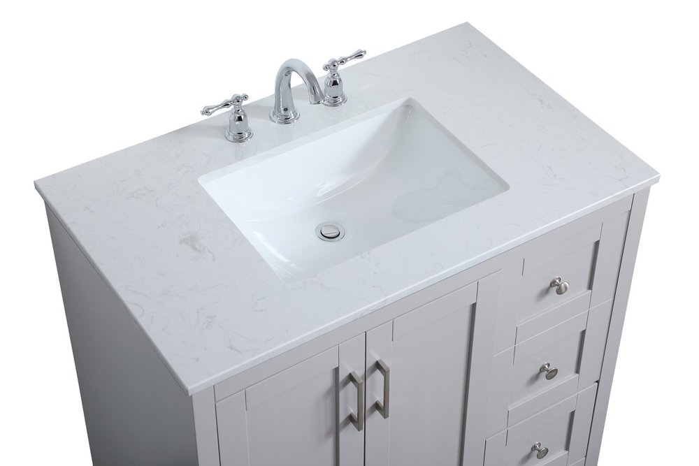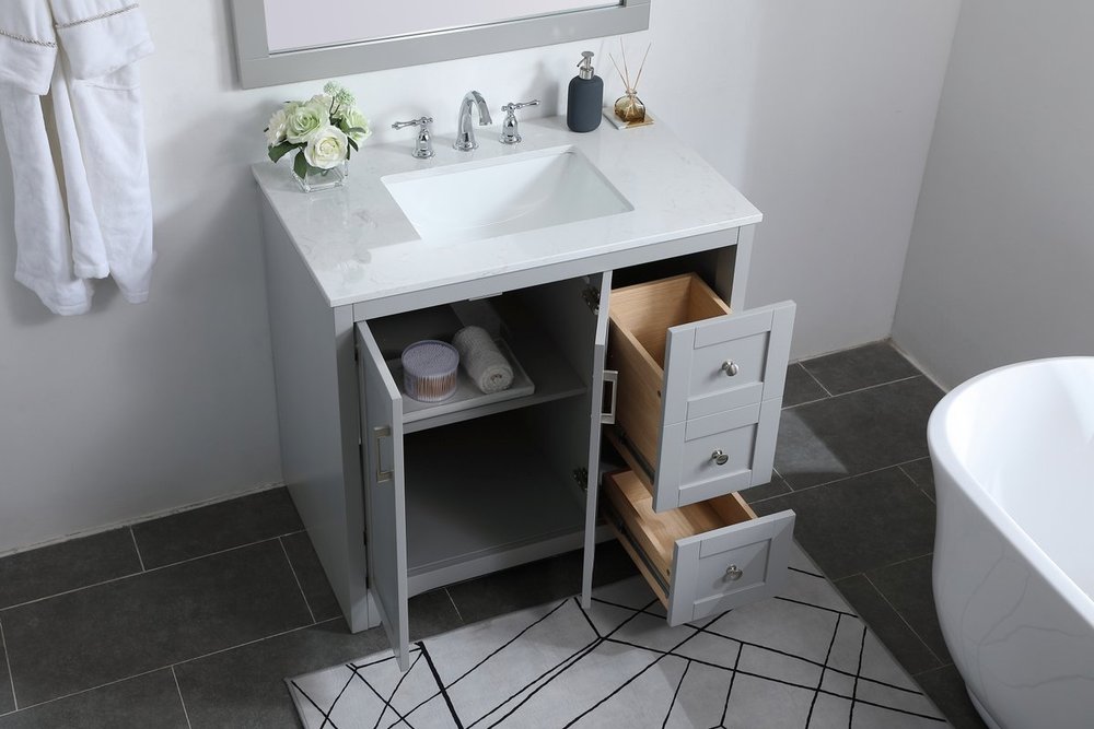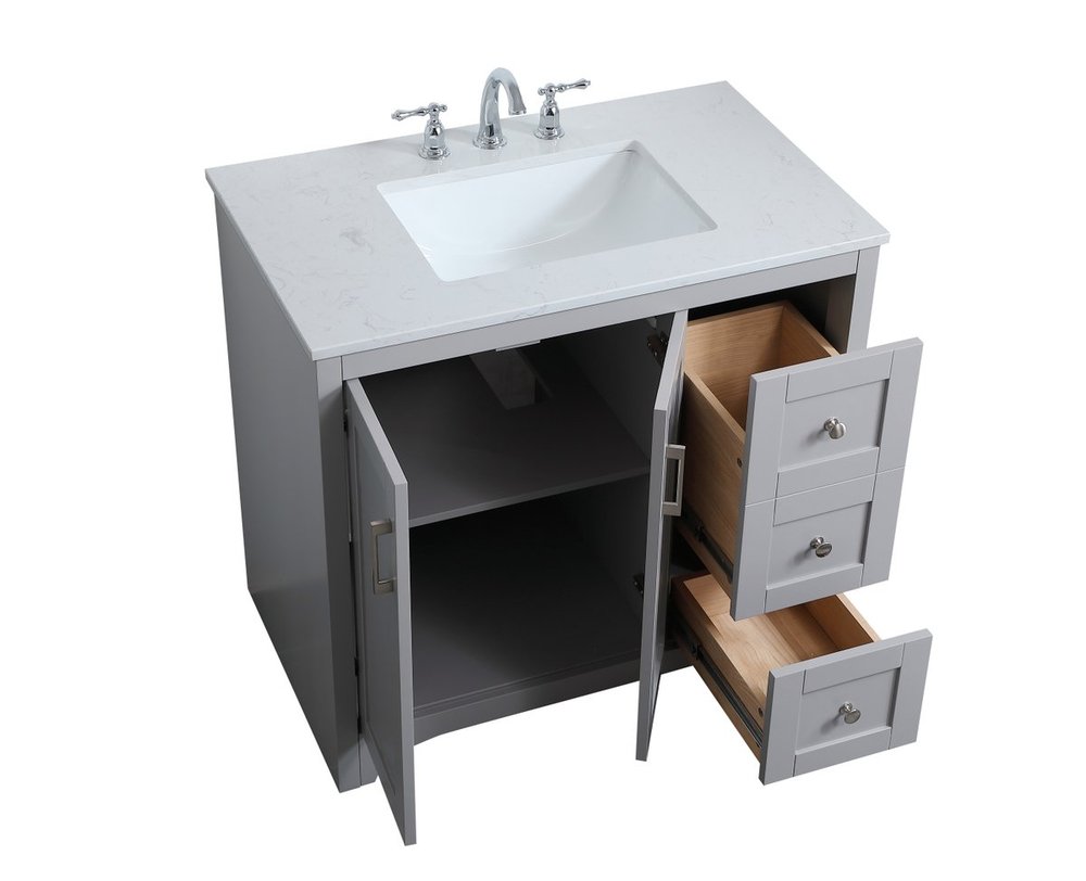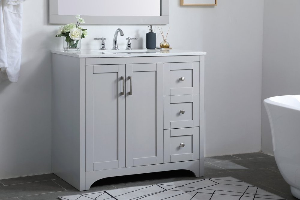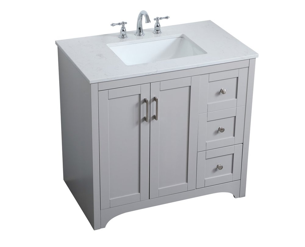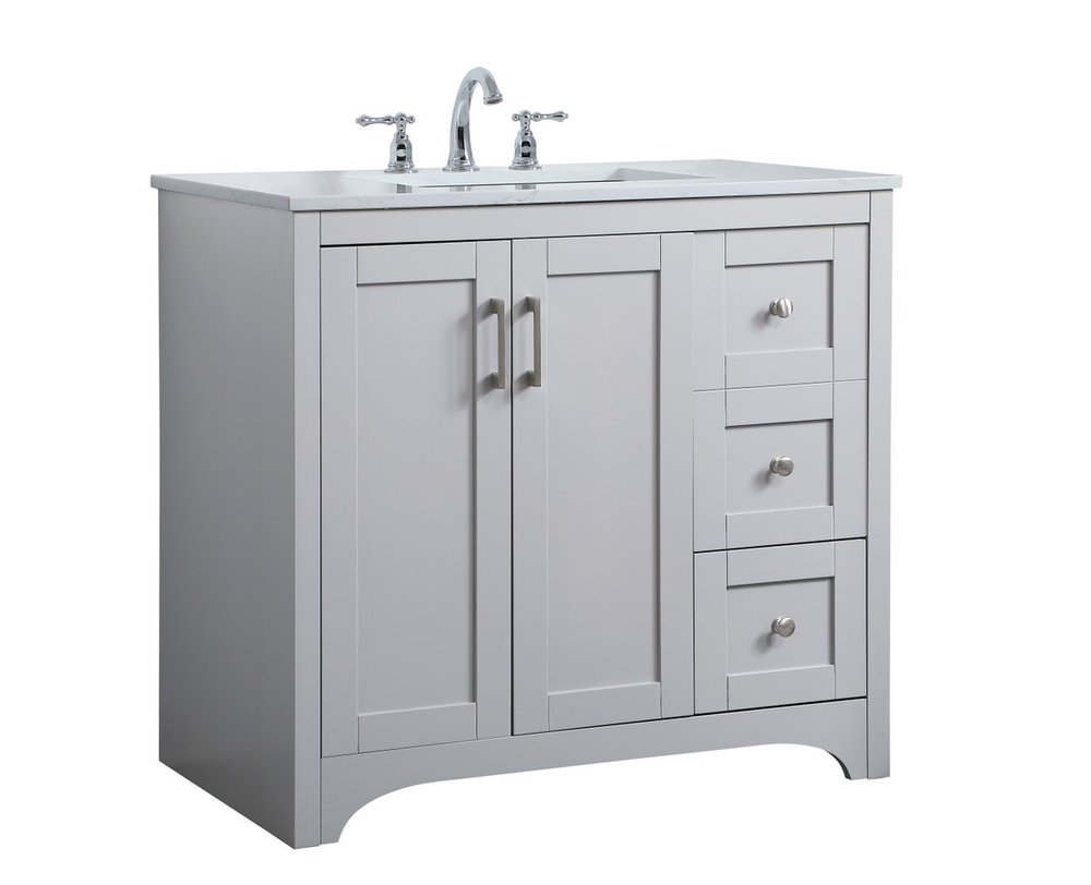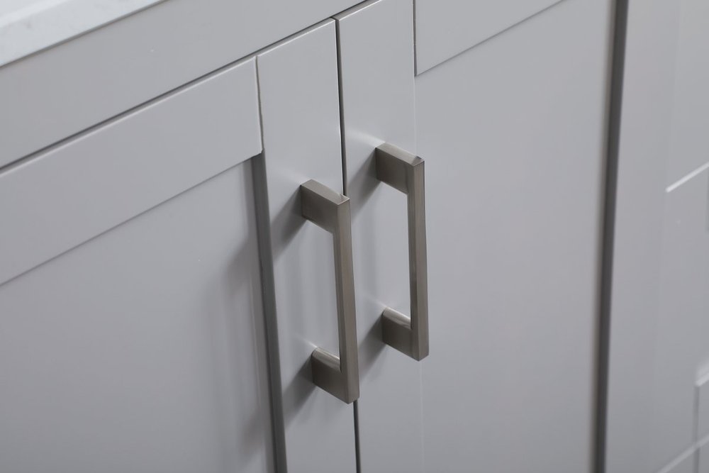 The refined simplicity of this 36" grey finish vanity creates a peaceful, yet stylish, atmosphere. Its traditional modernity adds a mature beauty that will elevate any bathroom or powder room--the Calacatta engineered marble counter top adds refined luxe while the brushed nickel handle bars open the double cabinet doors and 2 side drawers, revealing ample storage space to store and hide away an assortment of bathroom essentials. Whether your home is large or small, this vanity will surely fit in well.
