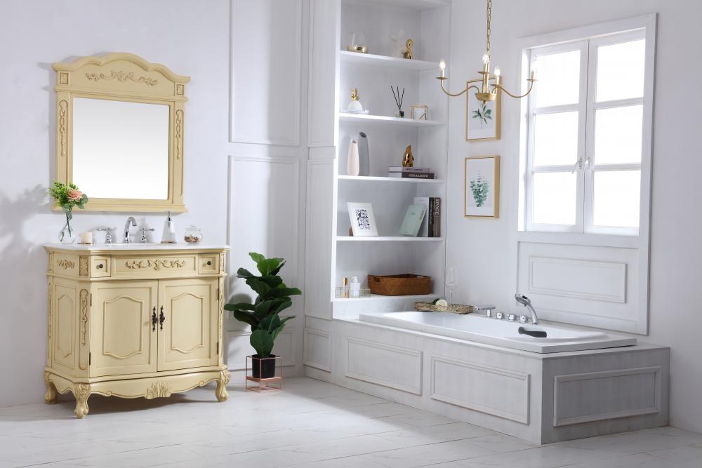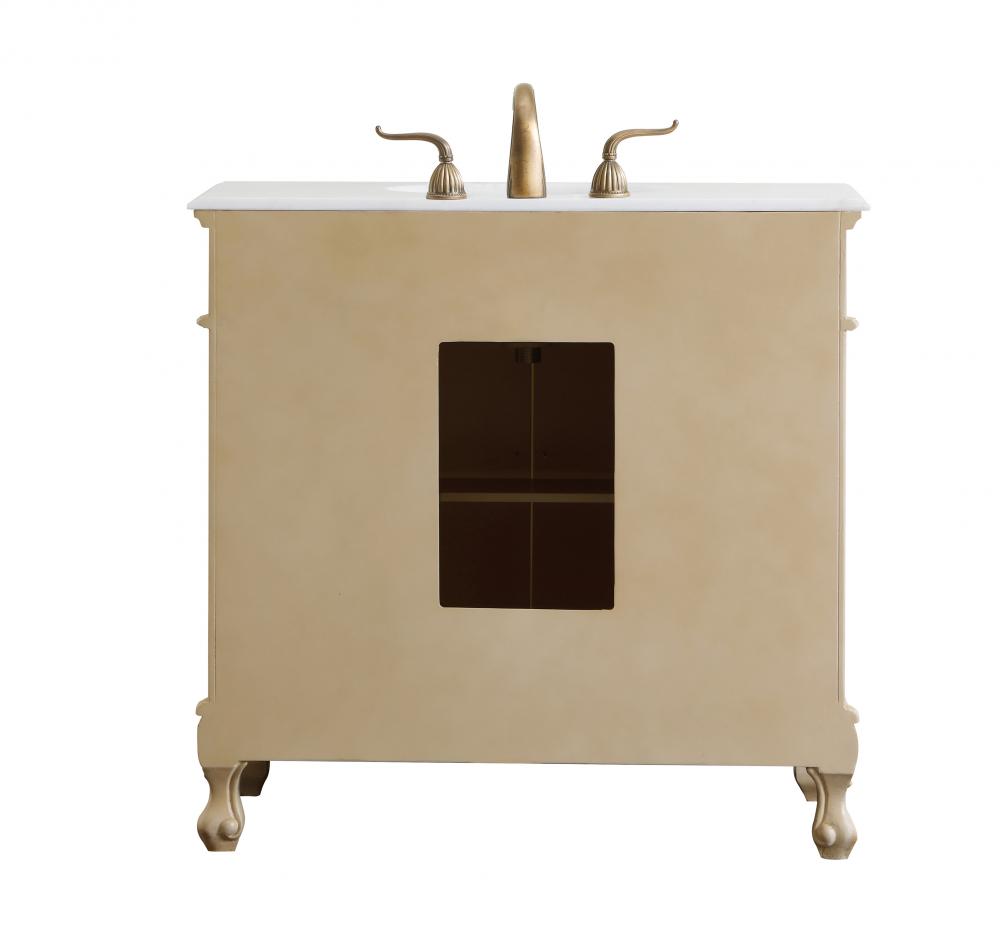 This superb balance of timeless tradition and opulent beauty in a engineered marble-topped vanity will certainly enhance the aesthetics of any home or office bathroom! Featuring an ivory white durable engineered marble countertop complimenting the hand painted cabinet with a delicate carved floral design, stands on stylishly carved solid wood French scroll feet. Don't let the design fool you, the engineered marble countertop and porcelain undermount sink allows for space to get ready, while the antique bronze hardware allows you to discover storage spaces with ease. You and your guests will marvel at this vanity that will both store away your bathroom essentials and enhance the aesthetics of your room.