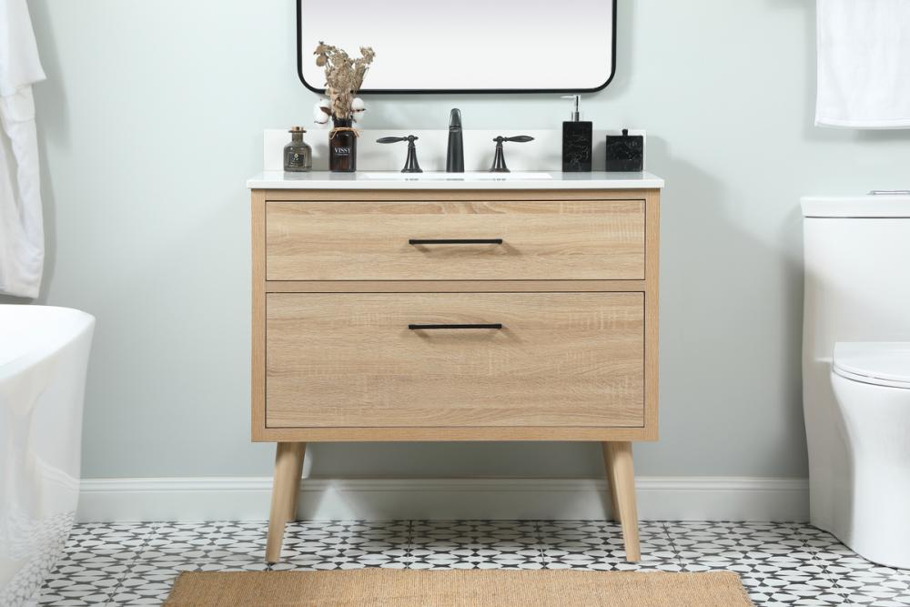 This bathroom vanity is a perfect way to outfit your home in authetic midcentury modern style. The clean lines anchors the design, while the oblique tapered cylinder legs add subtle interest. A black handle adorns the top drawer hiding the base of the undermount porcelain sink while another one allows you to pull the bottom drawer out, letting you store your bathroom necessities and toiletries. The storage drawers provide much needed function and can be used for stowing items like extra toothbrushes, hairbrushes, and other bathroom essentials to help you get ready to face the day. This vanity is a quick update for your bathroom with trendy style. Comes with a matching backsplash to complete the look and protects your wall.