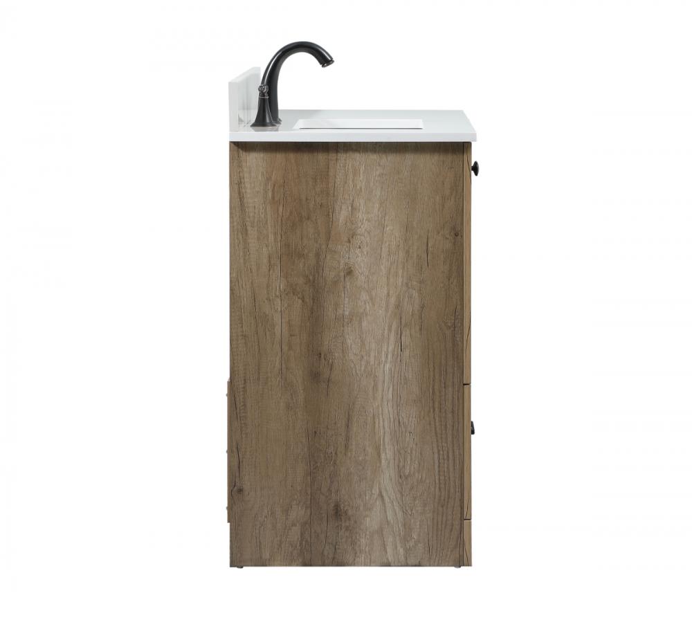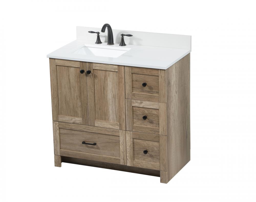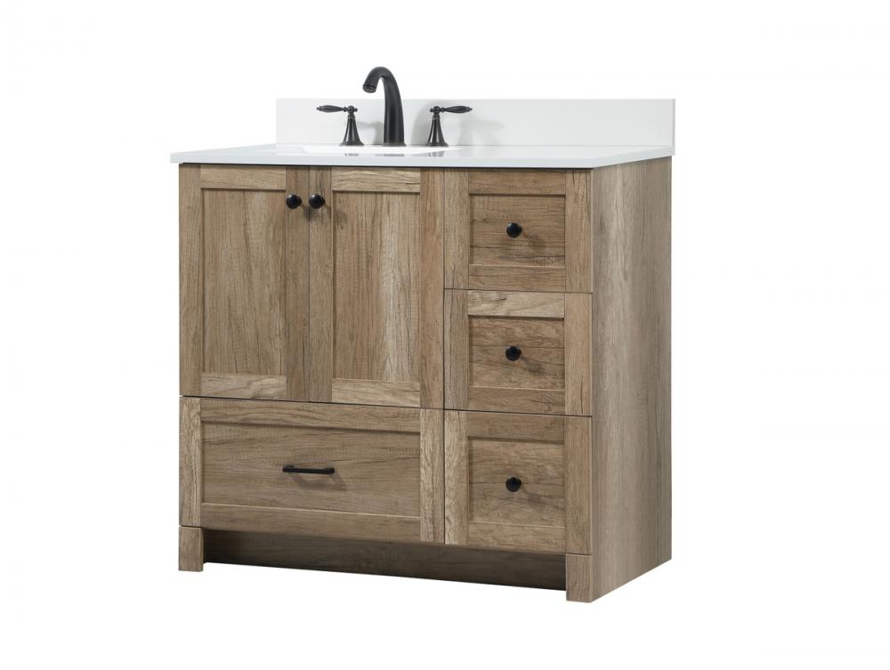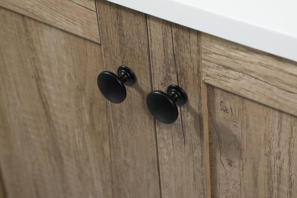 Delve into a world of minimalistic fashion and contemporary styling with this farmhouse 36" vanity. The clean faux lines anchors the weathered design. Black handle adorns the two doors hiding the base of the integrated porcelain sink while the bottom drawer and side drawers allow you to store your bathroom necessities and toiletries. It is the perfect vanity for any bathroom or powder room, regardless of size. Comes with a matching backsplash to complete the look and protects your wall.