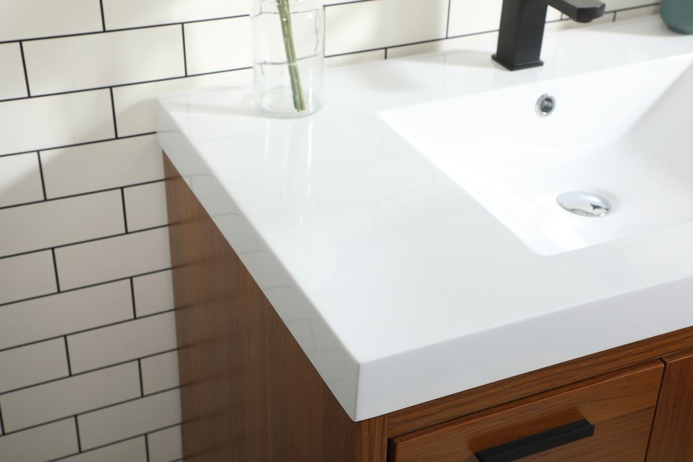 Modern sophistication is defined within the teak finish and black barpulls of this vanity. Its length makes it the perfect addition to any sized home, and saves space with its storage area hidden behind the double cabinet doors and one bottom drawers. Topped with a highly durable resin white counter top and an integrated sink, this modern design will add everlasting class to your bathroom and powder room.