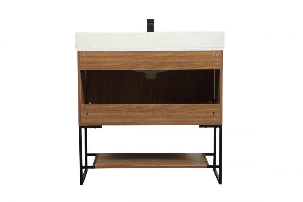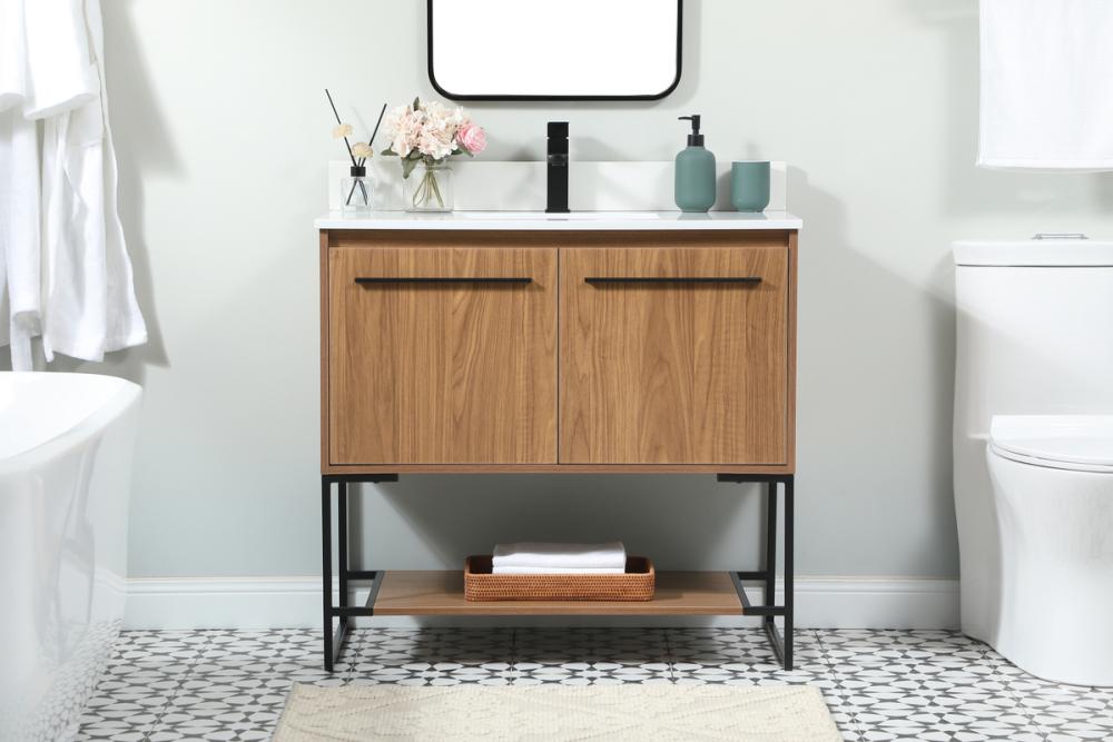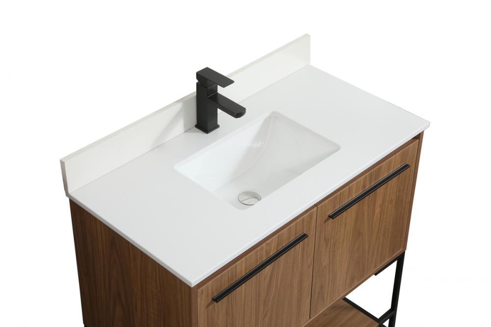 Live in comfort with this modern vanity. Dressed in a walnut brown and modern black metal hardware, its sleek style will have your bathroom or powder room elevated in industrial sophistication. The open shelf at the base and two doors reveal ample storage space for your bathroom essentials. Clean lines create its own visual interest, adding trendy looks to your already chic room. Comes with a matching backsplash to complete the look and protects your wall.