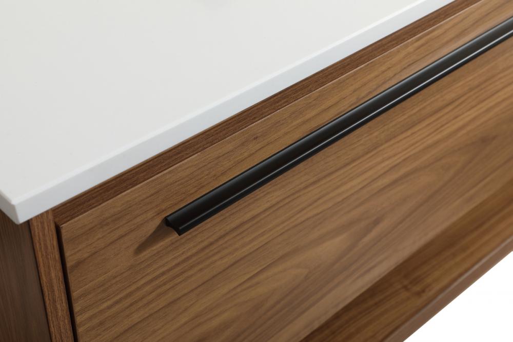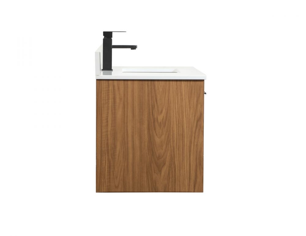 Save space and make your bathroom appear bigger with this floating vanity. Its minimal design will have you in awe, while its clean lines will leave your room feeling fresh and uncluttered. The Single u-drawer pulls out for storage while the open space below allows you to place extra towels or various other essentials. The ivory white engineered marble counter top with porcelain sink adds refined luxe while the aluminum barpull style handle adorn the vanity face. Comes with a matching backsplash to complete the look and protects your wall.