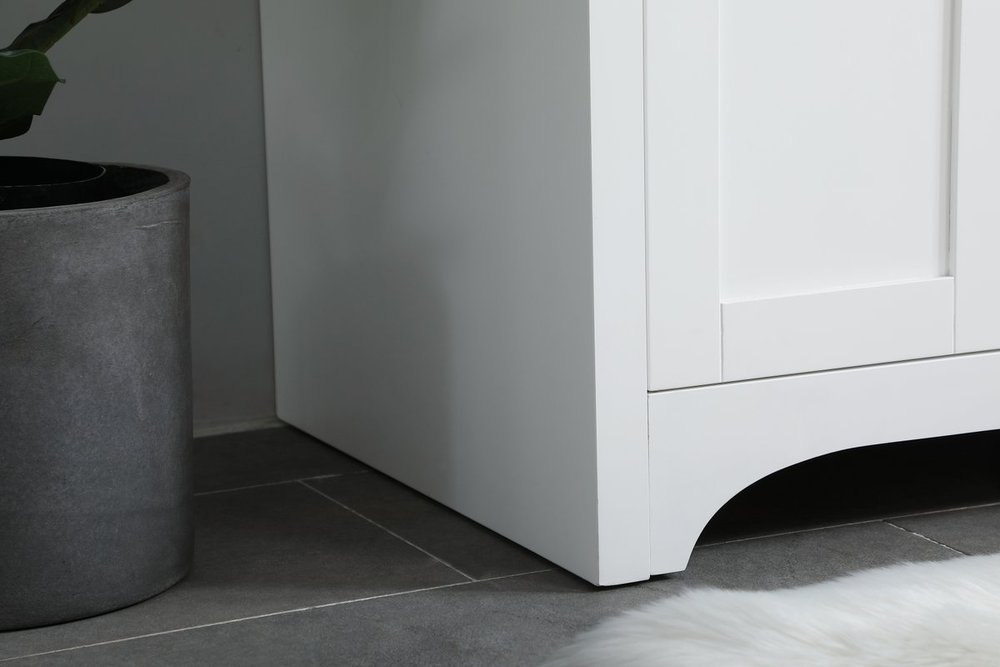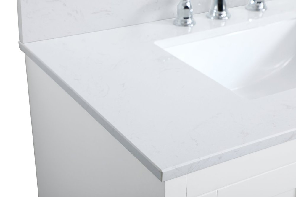The refined simplicity of this 36" white finish vanity creates a peaceful, yet stylish, atmosphere. Its traditional modernity adds a mature beauty that will elevate any bathroom or powder room--the Calacatta engineered marble counter top adds refined luxe while the brushed nickel handle bars open the double cabinet doors and 2 side drawers, revealing ample storage space to store and hide away an assortment of bathroom essentials. Whether your home is large or small, this vanity will surely fit in well. Comes with a matching backsplash to complete the look and protects your wall.