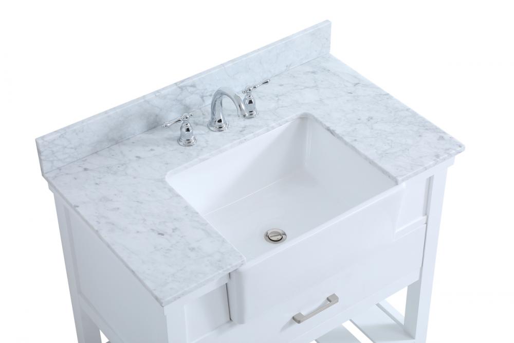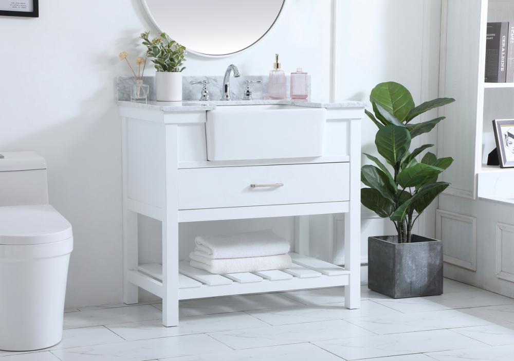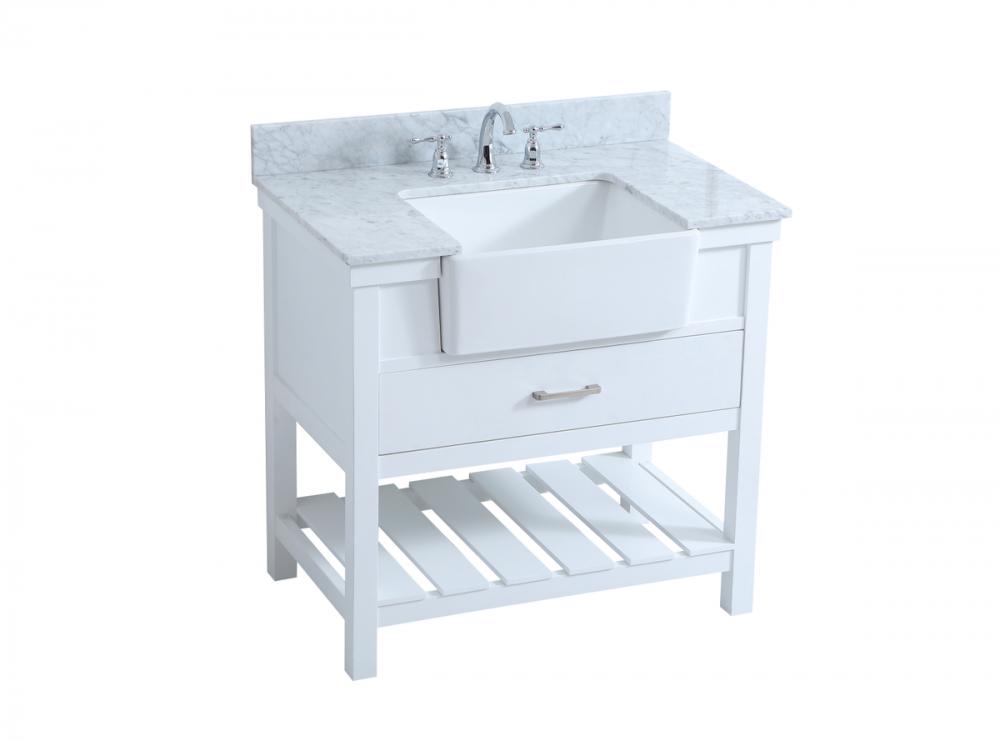 Make the most of your space with this farmhouse style bathroom vanity. Complements well with its beautiful finish, carrara white marble countertop, and the contemporary slender handle bar that sits on the functional drawers with soft closing mechanism, allowing you to store an assortment of bathroom essentials. The lower shelf makes it the perfect space to hold new towels for your guests. This stylish vanity ensures both form and function in your bathroom for you and your guests. Comes with a matching backsplash to complete the look and protects your wall.
