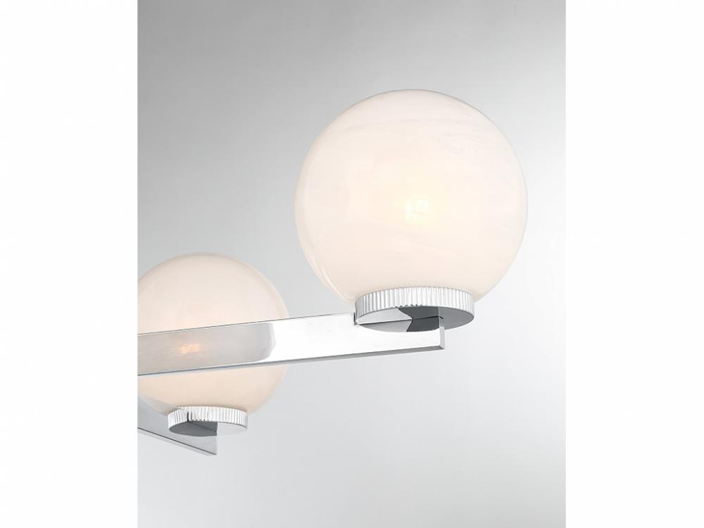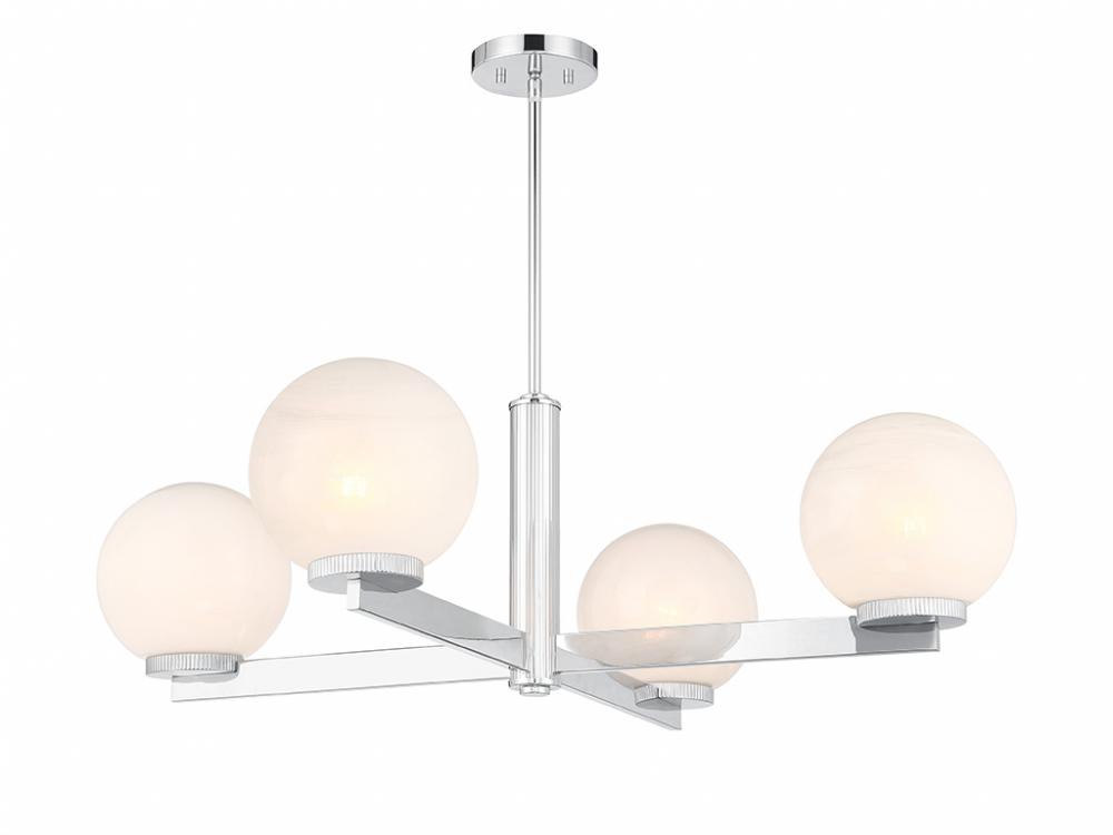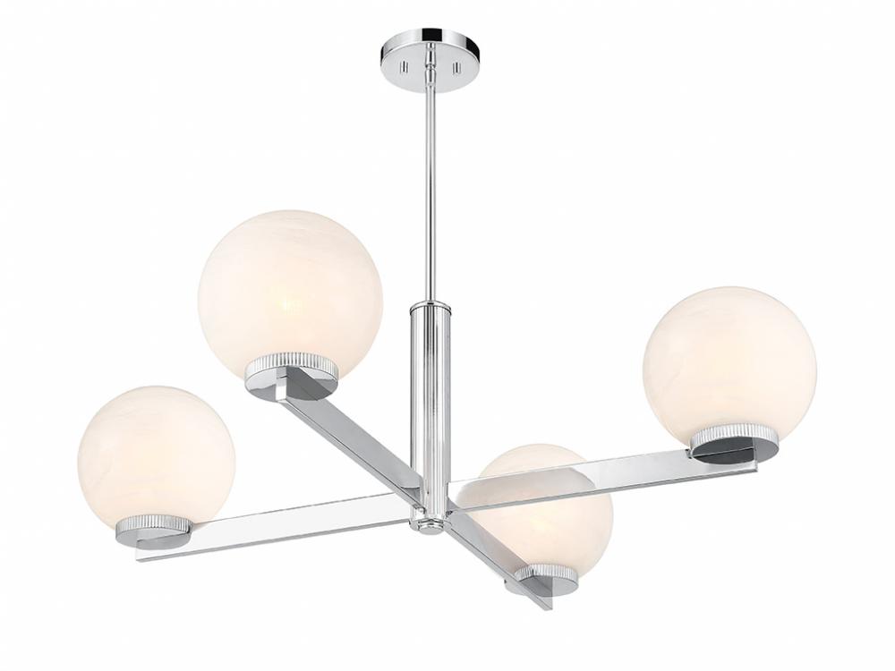 This 4-light chandelier flaunts a fabulously Art Deco look. Each slim, straight arm is topped with an orb of strie glass featuring dazzling swirls that draw the eye, soften the glow and work beautifully with the Chrome finish. Knurled detailing below each glass shade adds an extra touch of style. This chandelier is 38" in width and has an adjustable height ranging from 12" to 66". Comes with four 12" downrods and one 6" downrod. Uses 4 standard size bulbs of up to 60 watts per bulb. Bulbs not included.
