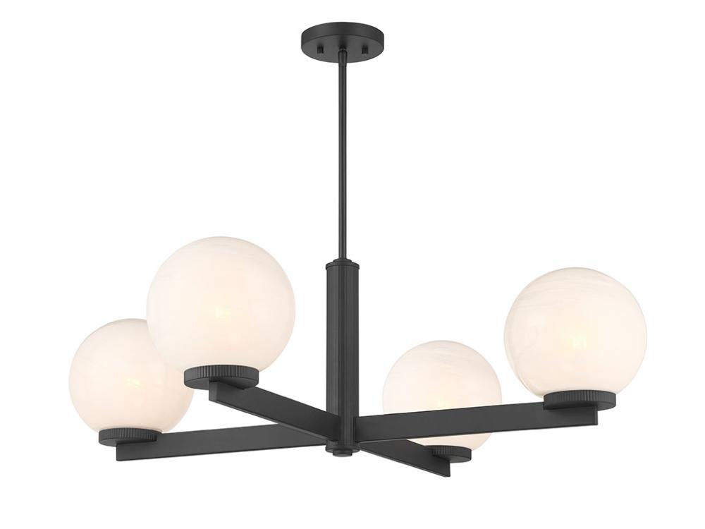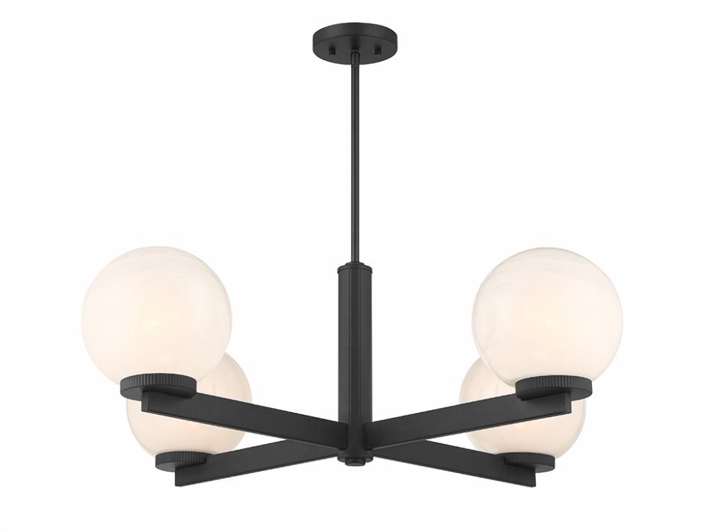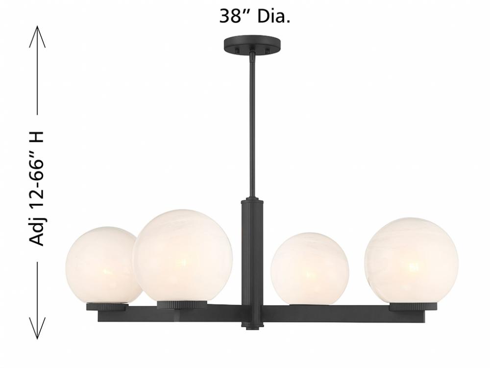 This 4-light chandelier flaunts a fabulously Art Deco look. Each slim, straight arm is topped with an orb of strie glass featuring dazzling swirls that draw the eye, soften the glow and work beautifully with the Matte Black finish. Knurled detailing below each glass shade adds an extra touch of style. This chandelier is 38" in width and has an adjustable height ranging from 12" to 66". Comes with four 12" downrods and one 6" downrod. Uses 4 standard size bulbs of up to 60 watts per bulb. Bulbs not included.