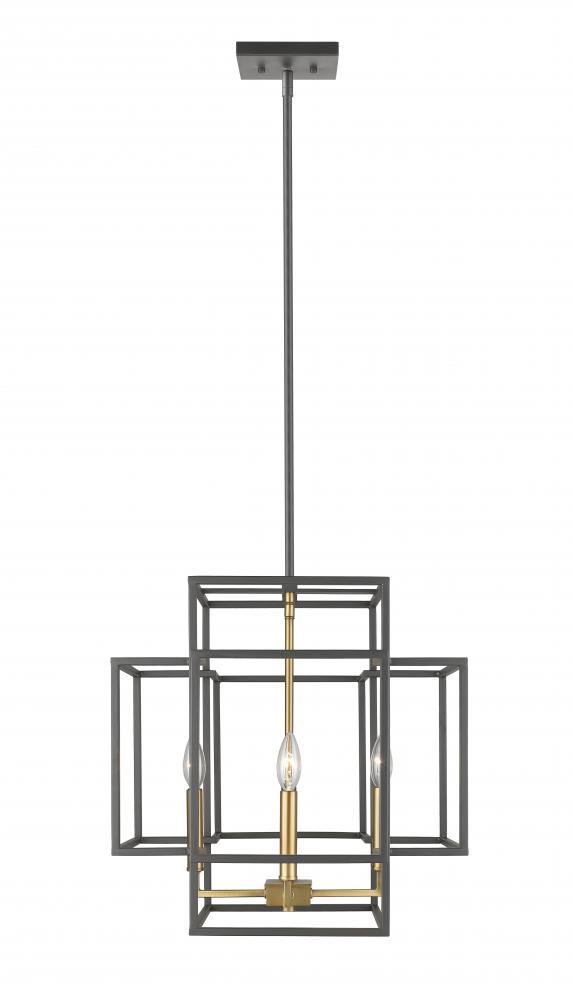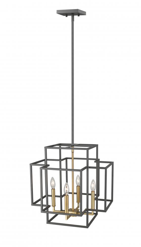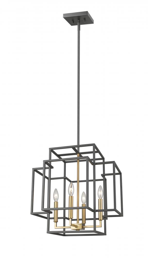 Indulge in a love of fresh modern style with softening touches, and add this bronze and olde brass steel four-light pendant to a custom room design. Candelabra-style bulb bases change up the crisp contemporary feel of an open geometric steel frame, yielding an expressive fixture that calls attention to a dining ensemble or living space.