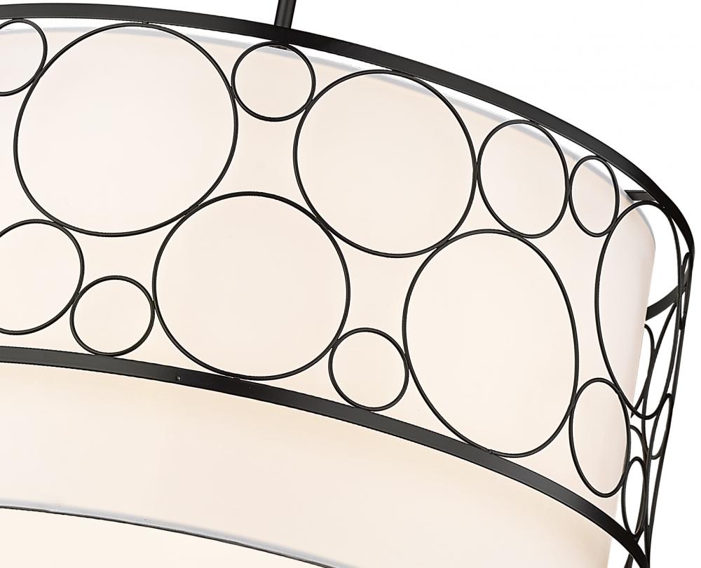 Transform an entryway foyer or draw the eye over a kitchen island with this elegant, transitional four-light pendant, designed as a tiered drum shape suspended from a straight steel rod. A stark matte black finish cage with a geometric bubble-like pattern offers a stunning contrast against the glow of the white fabric shade. A perfect addition for contemporary homes and retro-inspired Mid-Century Modern aesthetics, this transitional pendant light offers a chic, sophisticated expression.