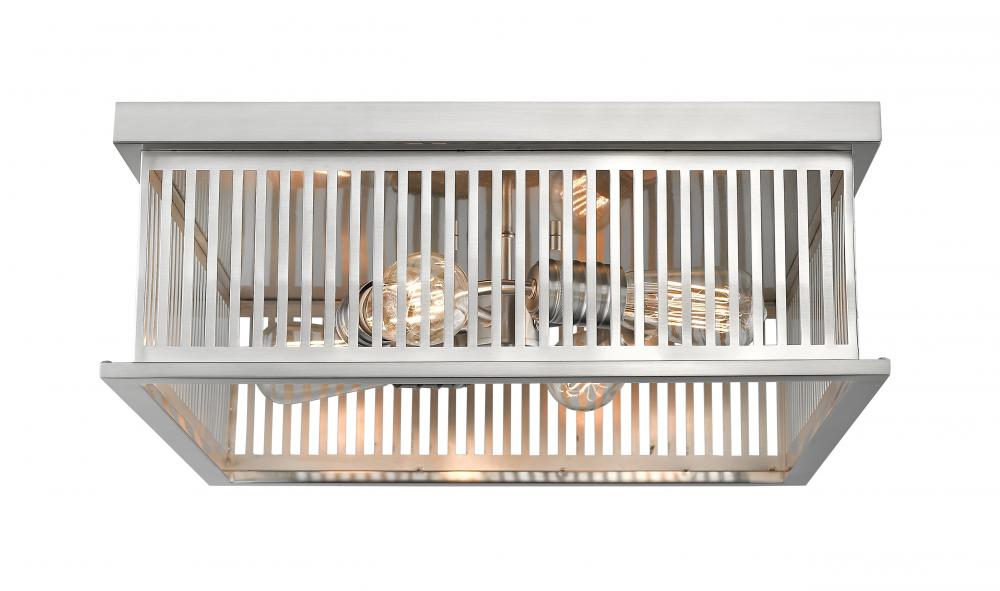 Bring an engaging look to a modern space with this industrial-themed four-light flush mount ceiling light. Its linear-style grid frame offers the beauty of brushed nickel finish steel and creates a peek-a-boo effect for its vintage-style bulbs.