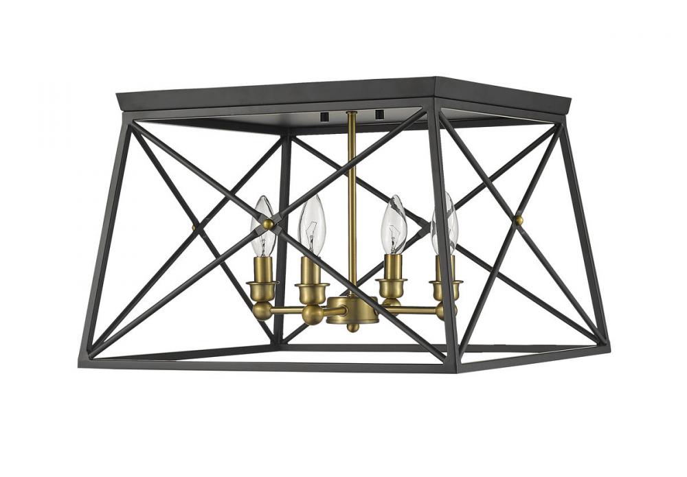 Indulge in an exercise of geometrics and stunning interior d?cor, adding this four-light flush mount ceiling light to a main living space. With an angular, open-concept cage frame made from Matte Black finish metal, its charming Old Brass finish candelabra bulb base offers a delightful contrast.