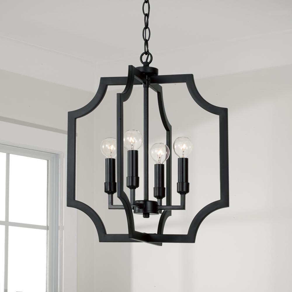 With the open, airy silhouette, the Courtney Lantern Foyer Pendant brings a charming aesthetic that doesn't overpower. The curved corners add chic appeal, while the Matte Black finish creates a bold, modern style.