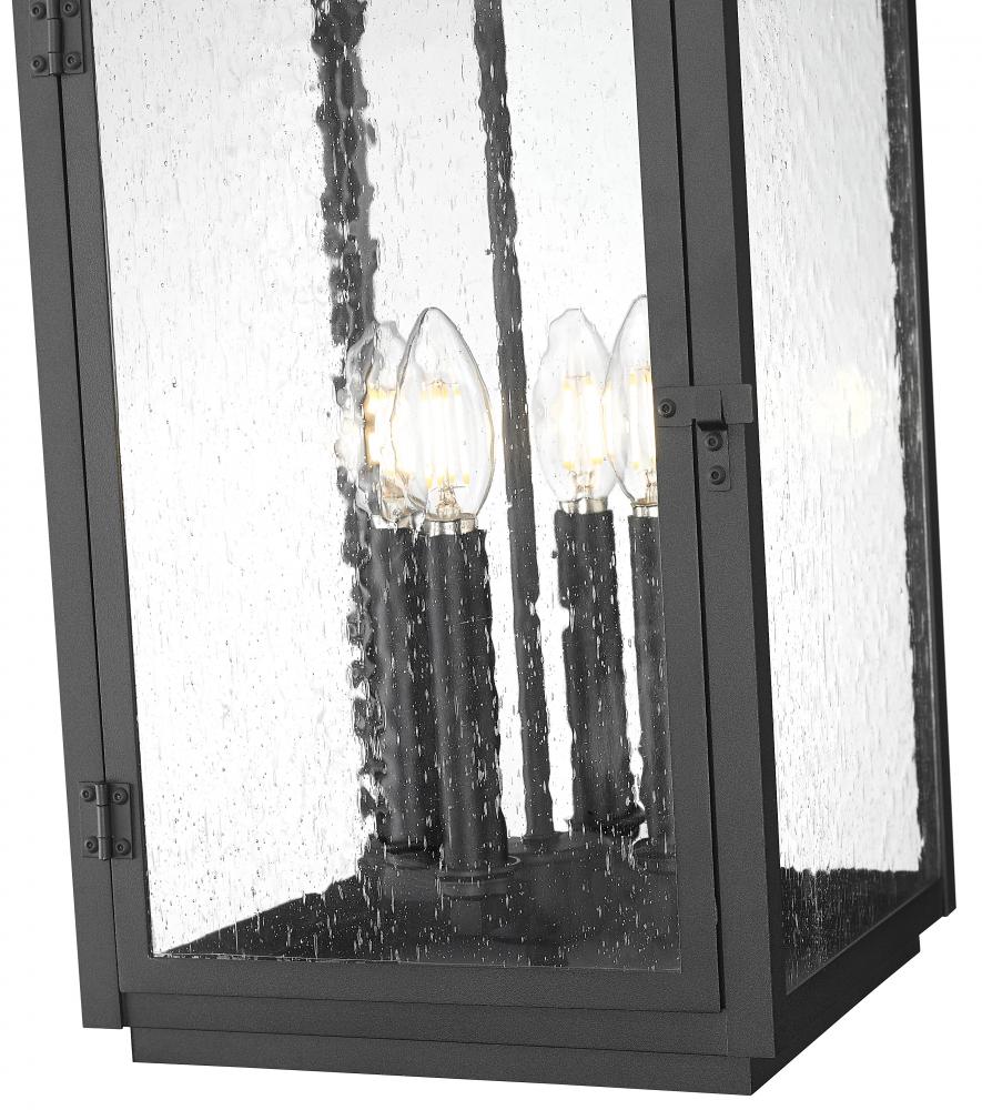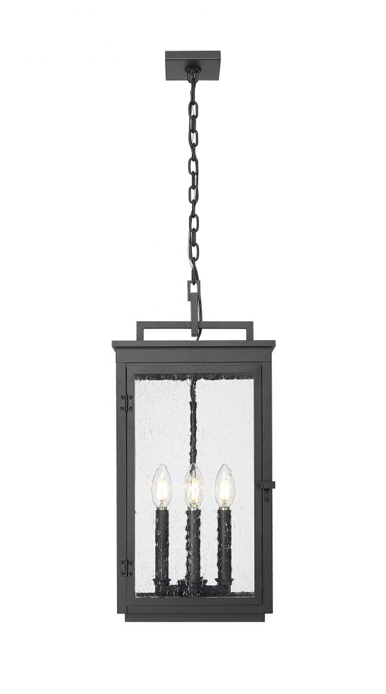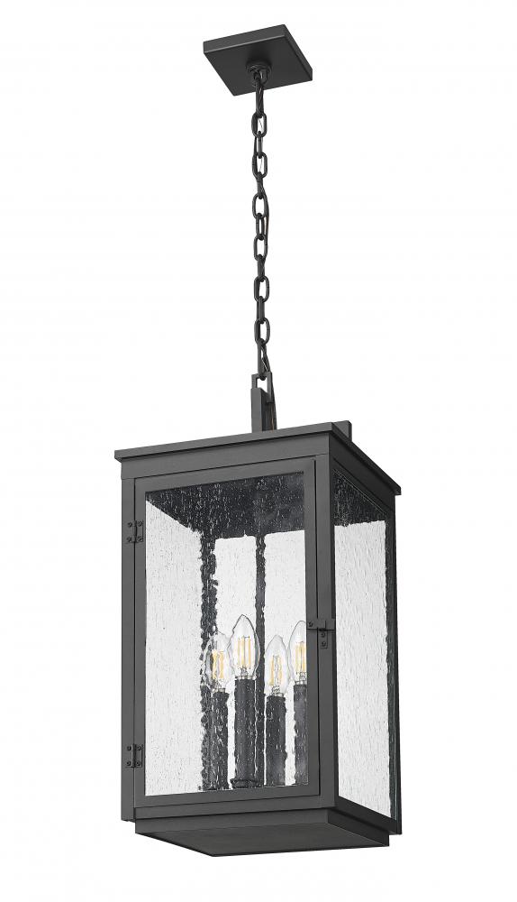 A moody masterpiece in sand black, this bold ceiling lantern floats effortlessly from its chain mount. Inside, four warm lights flicker behind clear seedy glass, casting a glow that feels both refined and inviting. The vintage-inspired top detail adds just the right touch of drama.