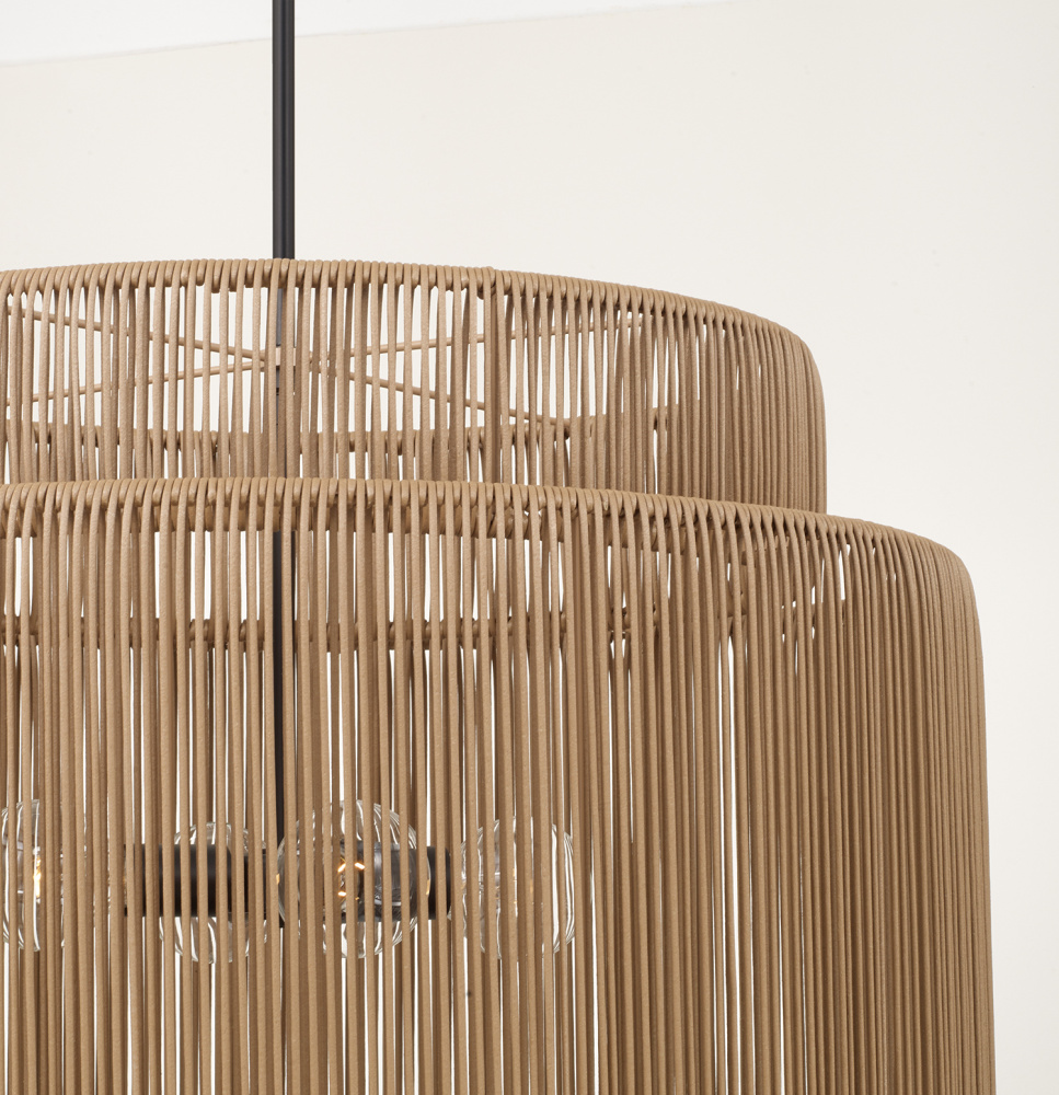 Purposefully crafted for interior and exterior spaces, the Jasper Indoor/Outdoor Large Pendant seamlessly blends durable design with high style. In a tiered drim silhouette, the weather-resistant hand-wrapped resin delivers a familiar aesthetic in warm Sienna brown, while the Matte Black finish gives a nod to modern style. Rated for Damp Locations and backed by our one-year warranty.