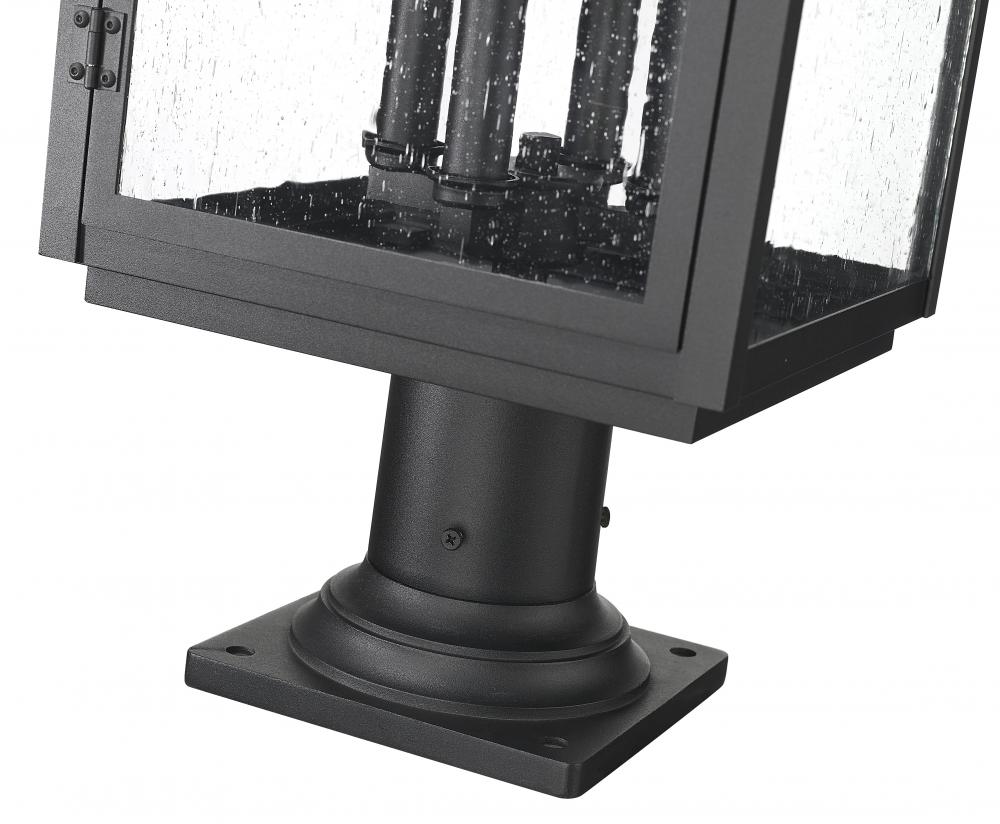 Charming candles behind clear seedy glass radiate light and character in this Mission four-light outdoor pier-mount fixture. Perfect for decks and pathways, it features a marine-grade sand black finish over aluminum framing, offering timeless allure to your porch or patio.