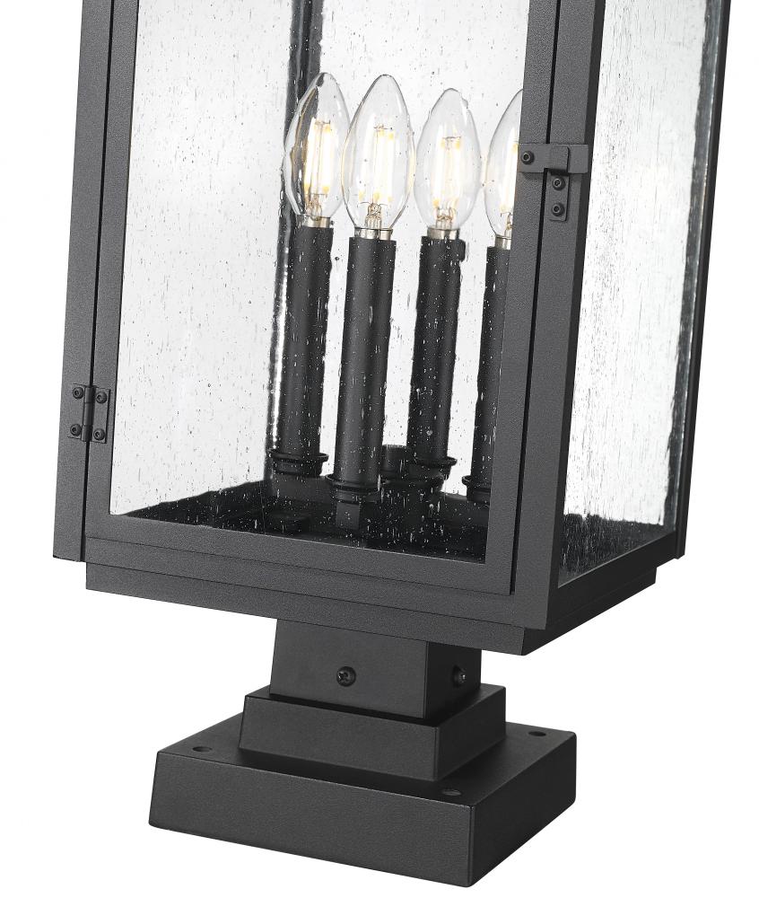 A charming handle detail pairs with clear seedy glass to bring charming flair to this traditional Mission four-light outdoor pier mount fixture. Perfect for curb appeal, it showcases subtle decorative details and candle-style lights that create inviting ambiance in your exterior spaces. A marine-grade sand black finish is a chic, timeless finishing touch.