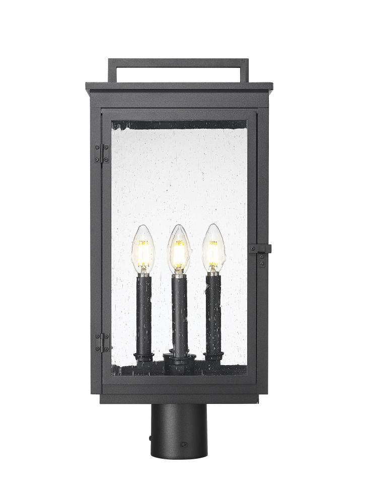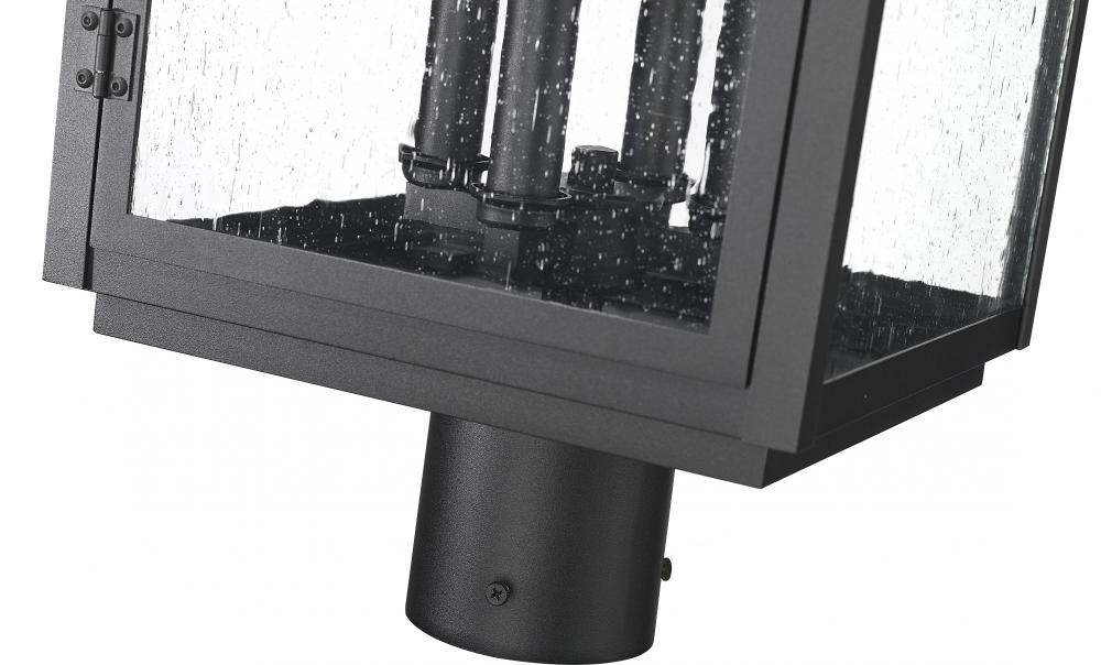 Standing tall in sand black and wrapped in rippling clear seedy glass, this four light outdoor post mount fixture brings serious presence. Four candle-inspired lights glow from within, casting a warm halo that feels like evening magic. The crown and handle detail give it a timeless elegance. It?s the finishing touch that turns any path into a moment.