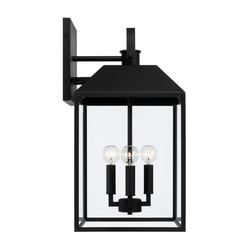 The Black finish punctuates the rectangular form, while the clear glass illuminates a warm welcome.