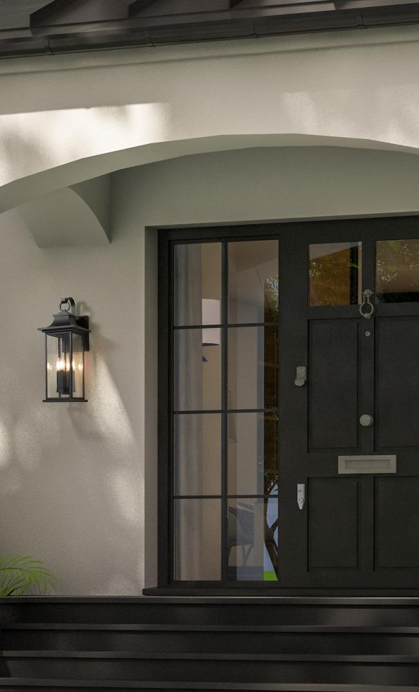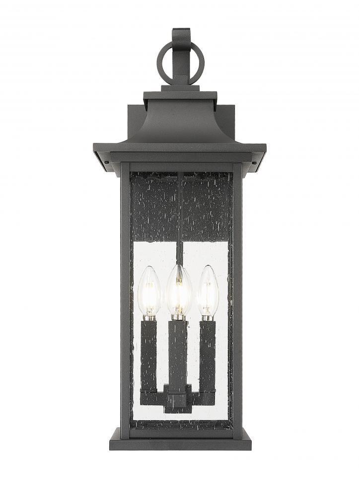 A floating cluster of candelabra lights is tucked behind clear seedy glass in this transitional four-light outdoor wall light. Its crafted in aluminum with a coastal black finish thats crisp and classic, perfect against the exterior of your home. Its lantern silhouette delivers stylish, approachable flair to a variety of decor styles.
