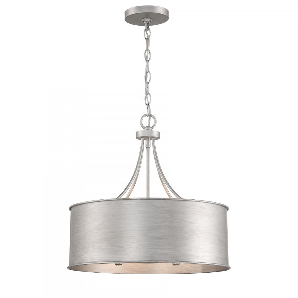 This 4-light pendant is the perfect way to bring timeless allure to any space. The drum-shaped solid metal shade, finished in Antique Silver, creates an eye-catching and appealing glow. 17.5" height and 18" width. Uses candelabra size bulbs, max 60 watts per bulb. LED bulb compatible. Comes with 120" of chain.