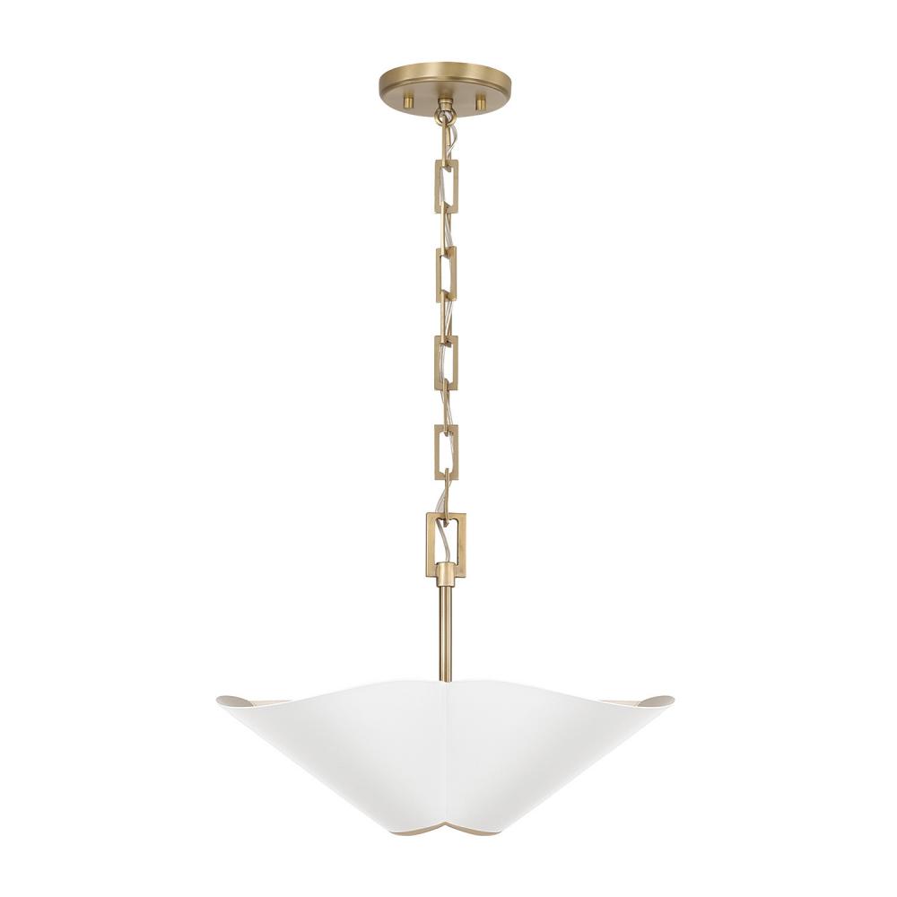 Invite all-around chic style with the 18.75 inch wide Maeve Small Dual Mount. Whether hung as a pendant or semi flush, the subtle curvature of the petal-like shade evokes a botanical feel, enhanced by the rectangular-shaped designer chain and sophisticated two-tone finish of smooth Matte White and painted Matte Brass interior.