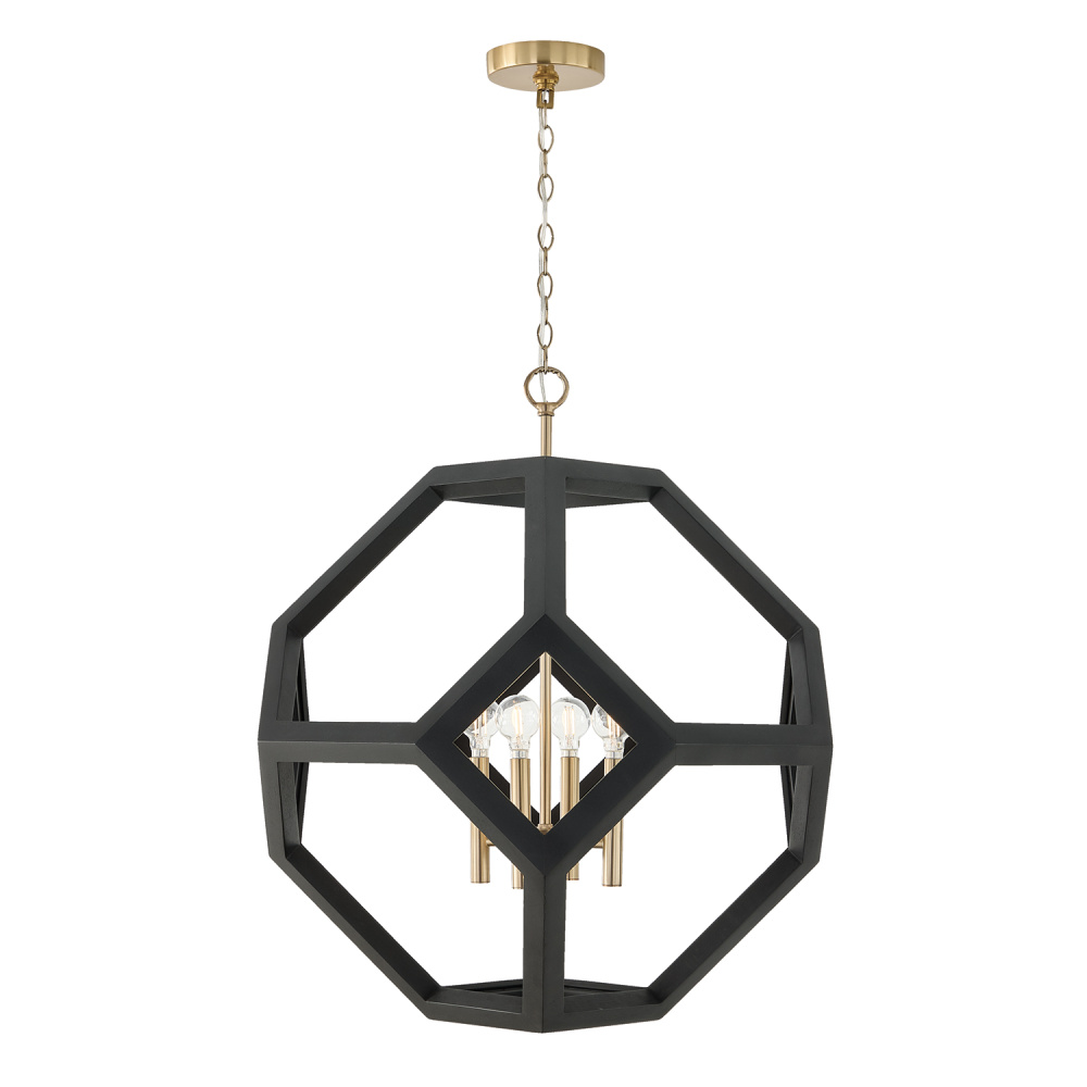 Structural and intriguing, the Geo Pendant seamlessly blends modern design and organic materials. Handcrafted of mango wood, the dimensional orb silhouette offers geometric windows to the Matte Brass cylindrical candle sleeves, creating angular beauty in the Flat Black wood finish.