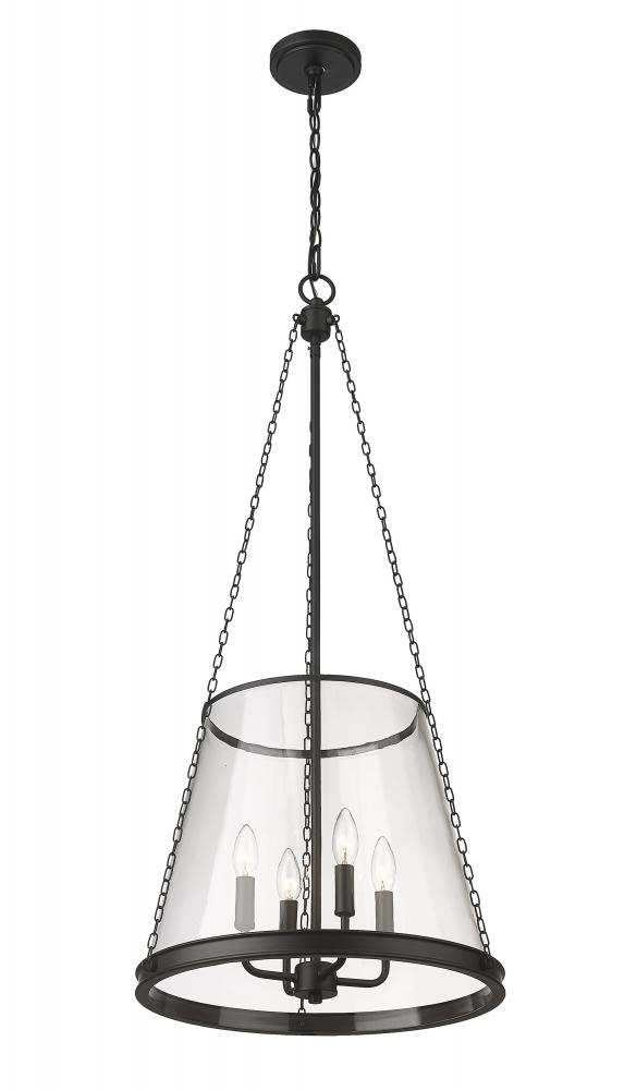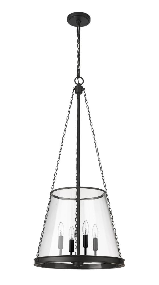 A contemporary take on an architectural restoration style classic, this transitional four-light pendant presents a stark matte black finish that offers a striking contrast and minimalist touch to dining rooms and interior spaces. Perfect for spacious foyers and living rooms, this four-light pendant creates a breathtaking urban aesthetic and illuminates a space wonderfully with its four-arm candelabra style light that sits inside an elegantly tapered clear glass shade suspended by industrial style chain link supports.