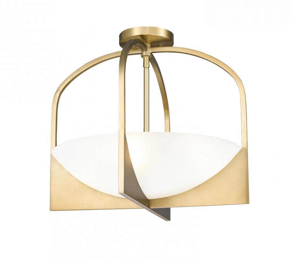 Transitional and modern spaces benefit from the bold design of this sculptural modern gold finish four-light semi-flushmount light, built from a blend of steel and glass. With an open-concept and rounded silhouette and textural sand blast finish effect, its artisan creds turn an industrial look into a gallery-inspired example. Light filters through a waterglass bowl diffuser, minimizing harsh glare and delivering pleasing illumination to a foyer, kitchen, dining room, or bedroom.