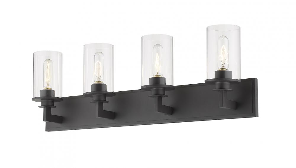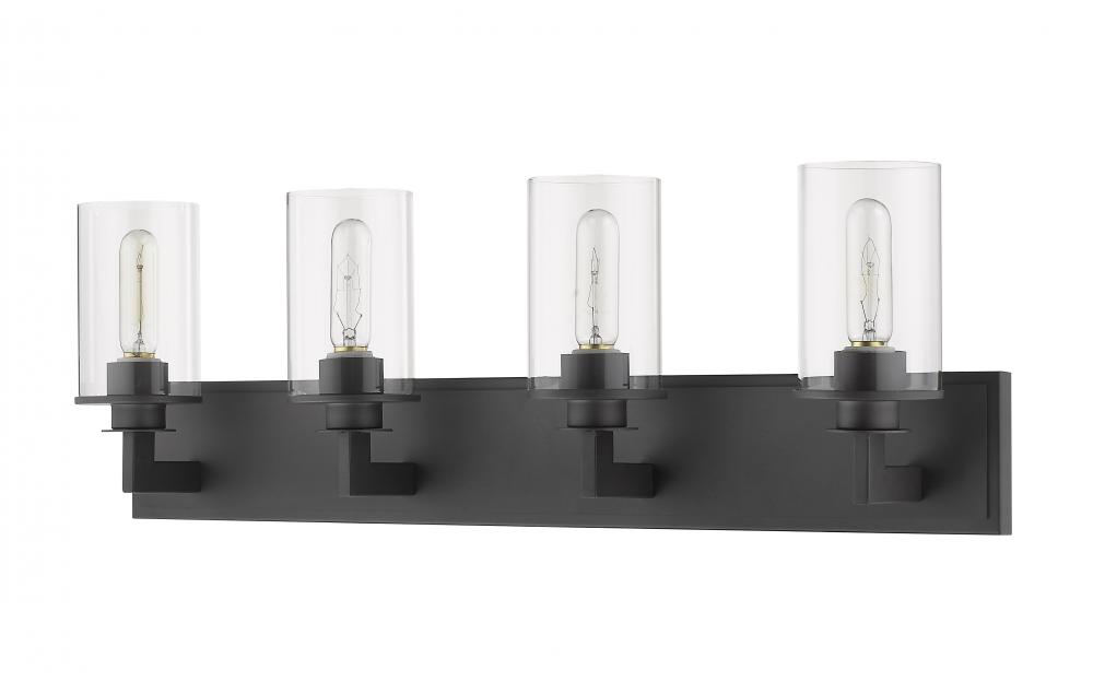 A sense of cozy warmth adds awesome appeal to this mid-century modern four-light vanity. A deep bronze finish adds a rustic emphasis to the lovely clear glass cylinder shades.