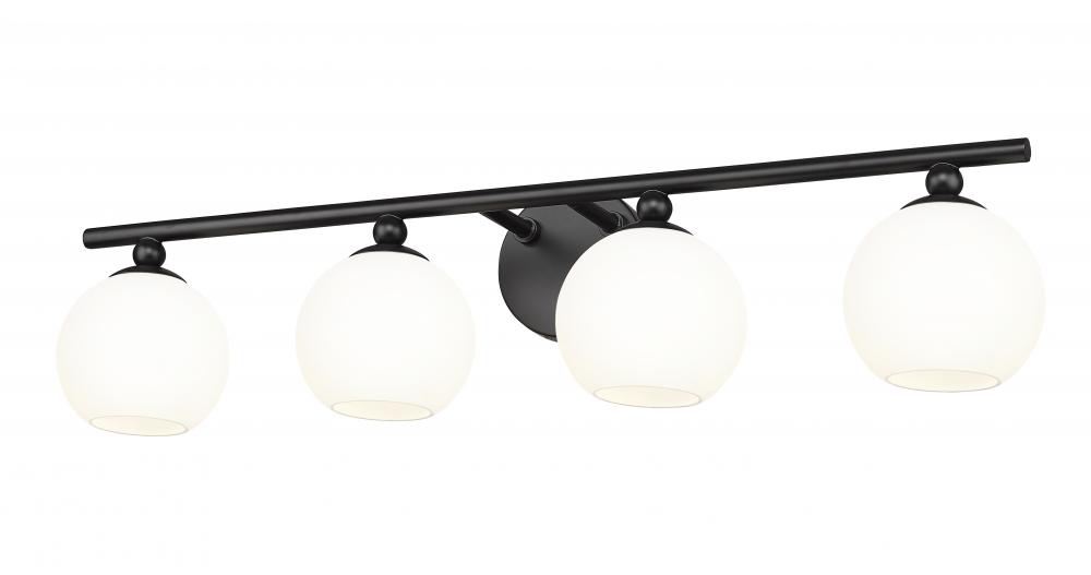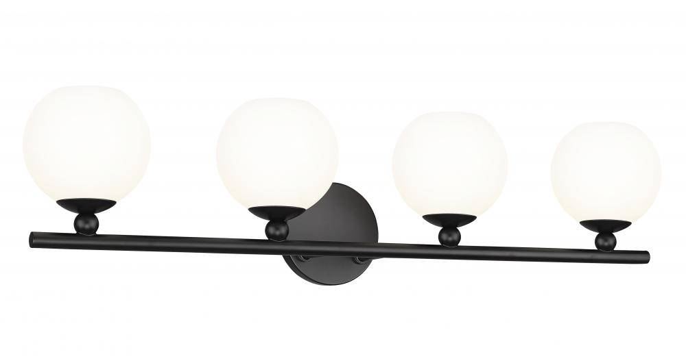 From the Neoma collection comes a tastefully elegant yet festive and fun fixture perfect for modern ensuite or guest bath spaces. This four-light vanity wall light shows off iconic globe shades made of opal etched glass and a bold matte black finish steel frame and mount showcasing a minimalist vibe. Contrast and expressive style merge to create a wall light with a hint of retro influence delivering personality along with ambient lighting for a contemporary bathroom.