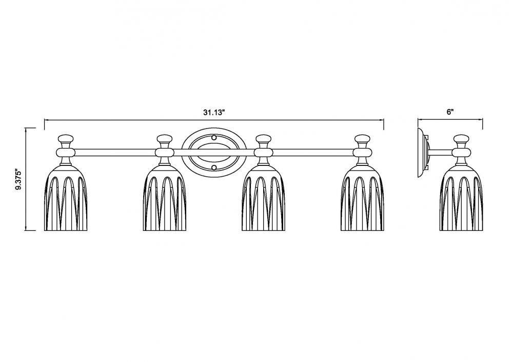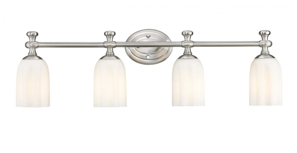 Etched opal glass is gently scalloped to create movement and refined character for a modern four-light vanity fixture. A lovely brushed nickel finish adds a decorative touch, highlighting chic embellishments and an oval stepped wall plate. Its bright, diffused illumination is ideal for morning and evening grooming and beauty rituals.