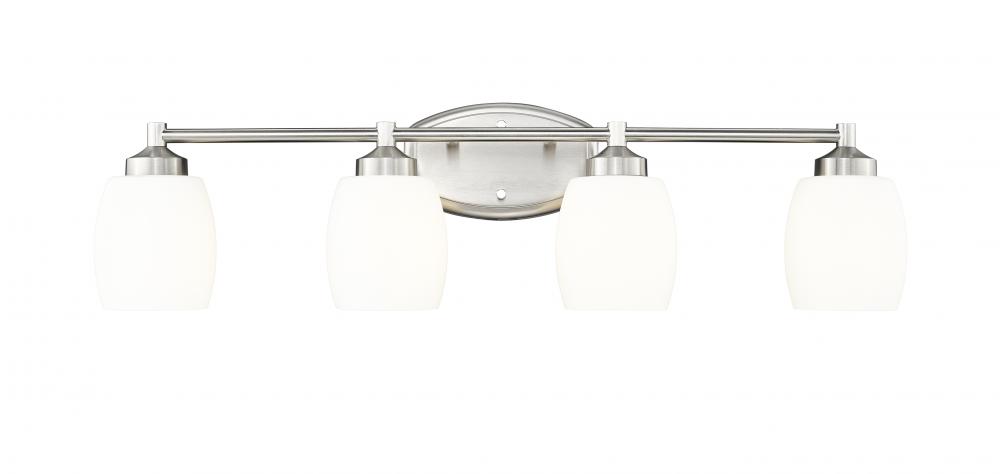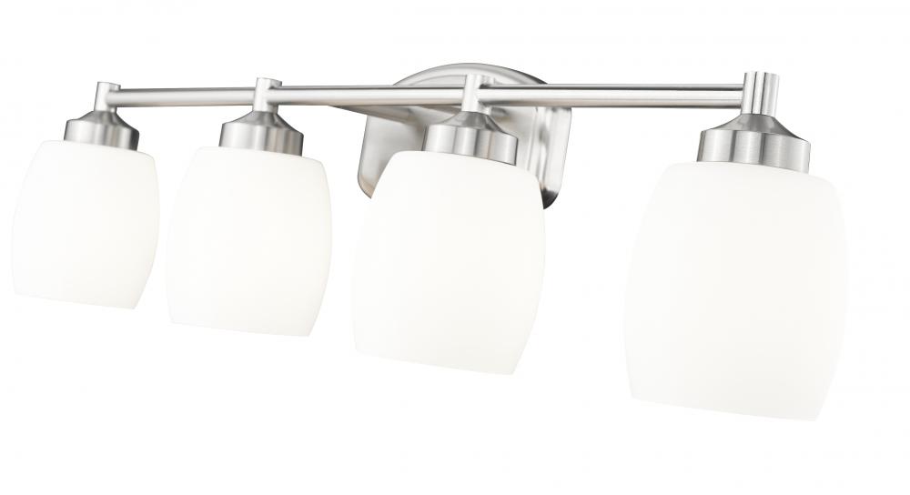 From the Kendrick collection, this modern four-light vanity fixture is a soothing choice that highlights organic curves in a compelling composition. Perfect for a generous counter space, it delivers a sleek silhouette with a brushed nickel finish that gleams in the light. Matte opal glass shades echo the rounded shape of the wall plate while assuring soft, but bright illumination for all your morning and evening rituals.