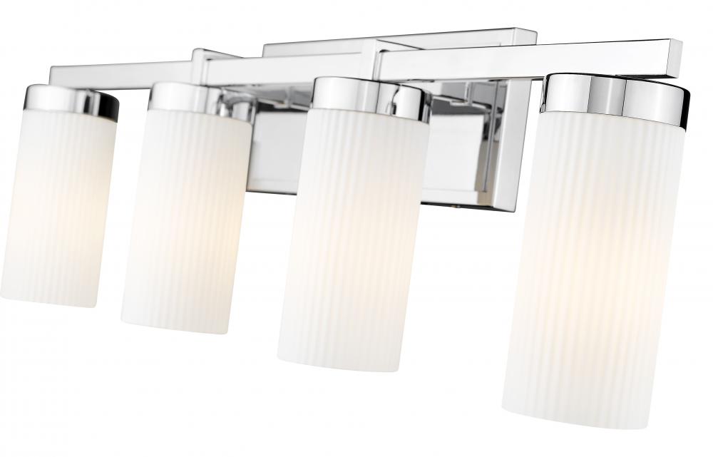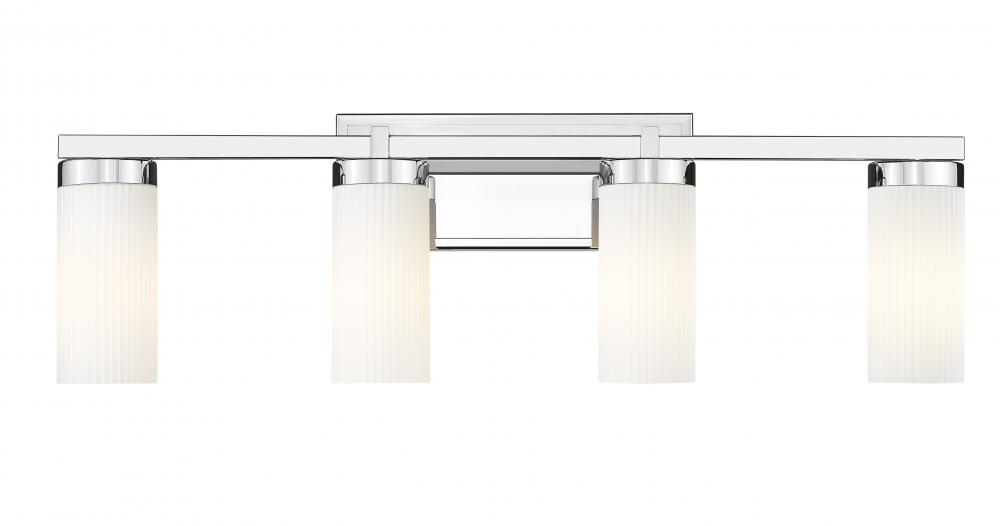 Shimmering chrome meets graceful repetition in this four-light vanity fixture. The ribbed glass shades glow with layered texture, offering a soft yet striking contrast to the high-shine frame. Thoughtfully scaled for wider vanities, it brings a tailored elegance to every reflection.